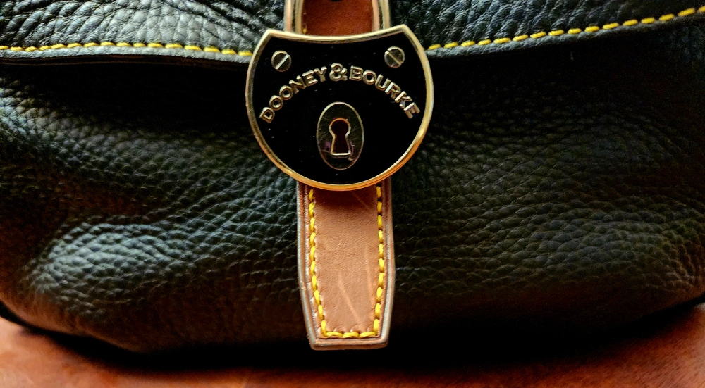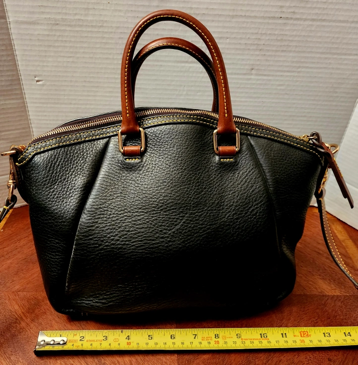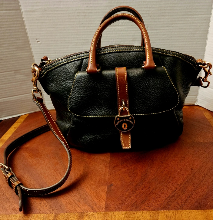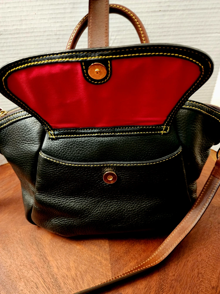 Pebbled black leather satchel. Brown leather accents. Top handles and a detachable shoulder strap. Zipper closure. Red interior lining. Small interior pocket.