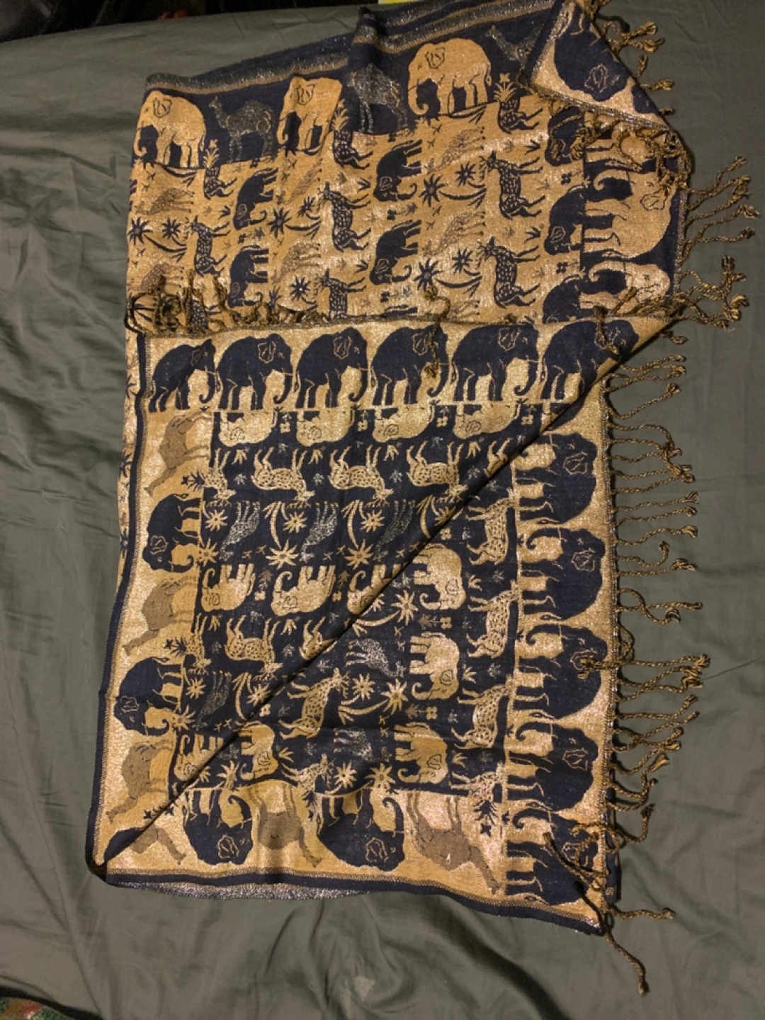 Beautiful woven scarf, featuring elephants, giraffes, and other safari animals. Dark navy blue and gold accents. Fringed edges. Soft and cozy.