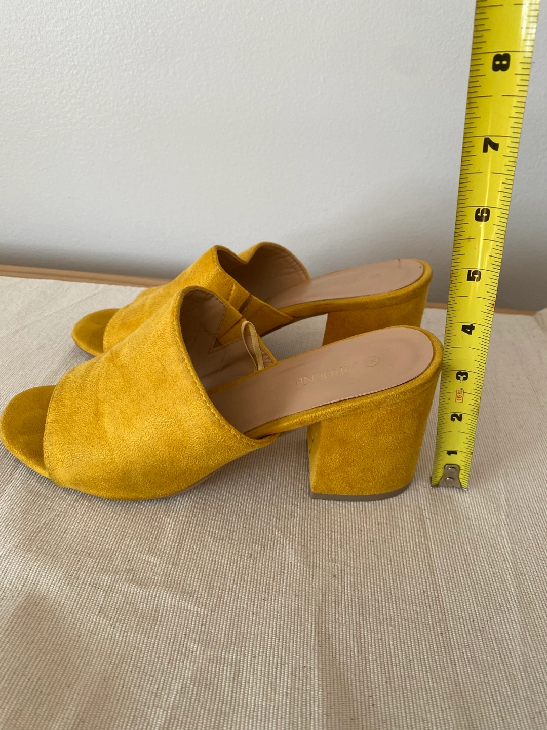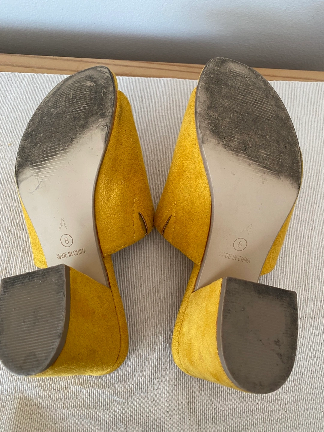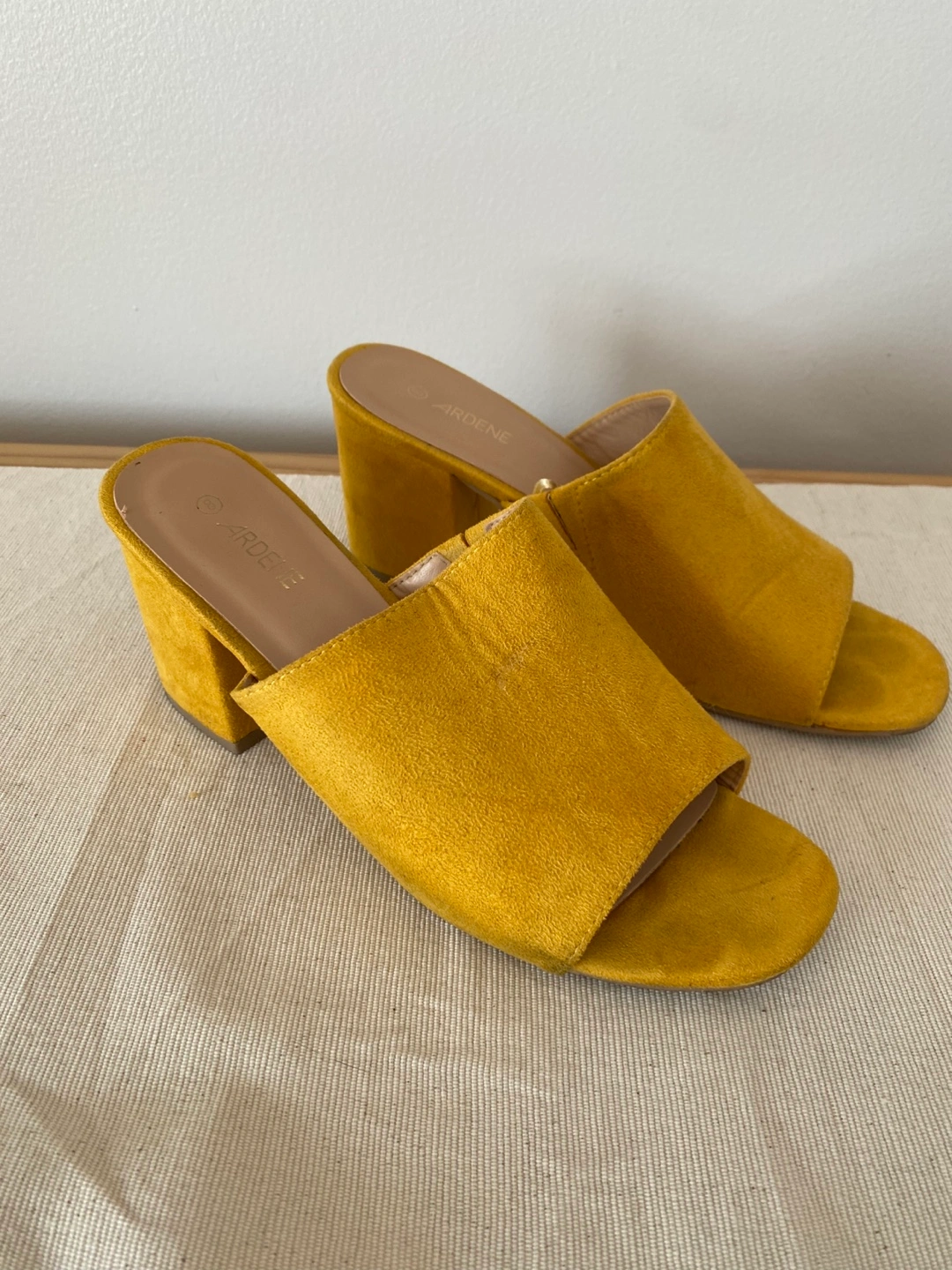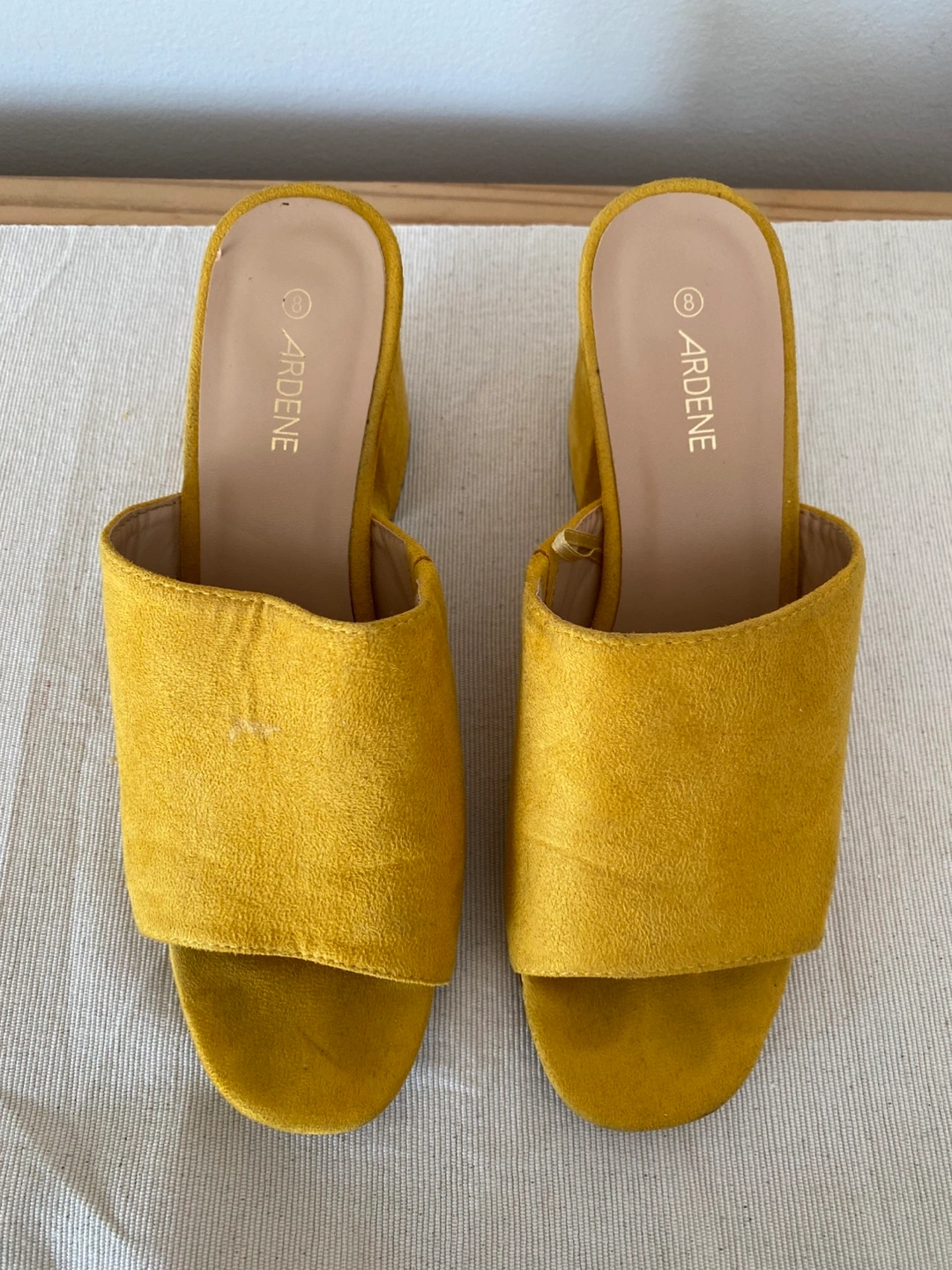 •Excellent condition, clean, no breakage •Ardene •Women's suede mules •Colour: Yellow mustard Block mule •Size: 8 •Open toe, Slip-on style •smoke-free, pet-free environment **LOCATION: Jane & Lawrence**