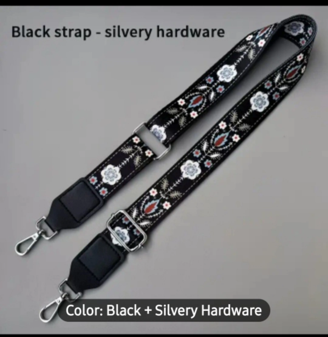 Adjustable bag strap. Black fabric with colourful embroidery. Silvery metal hardware. Two lobster clasps.
