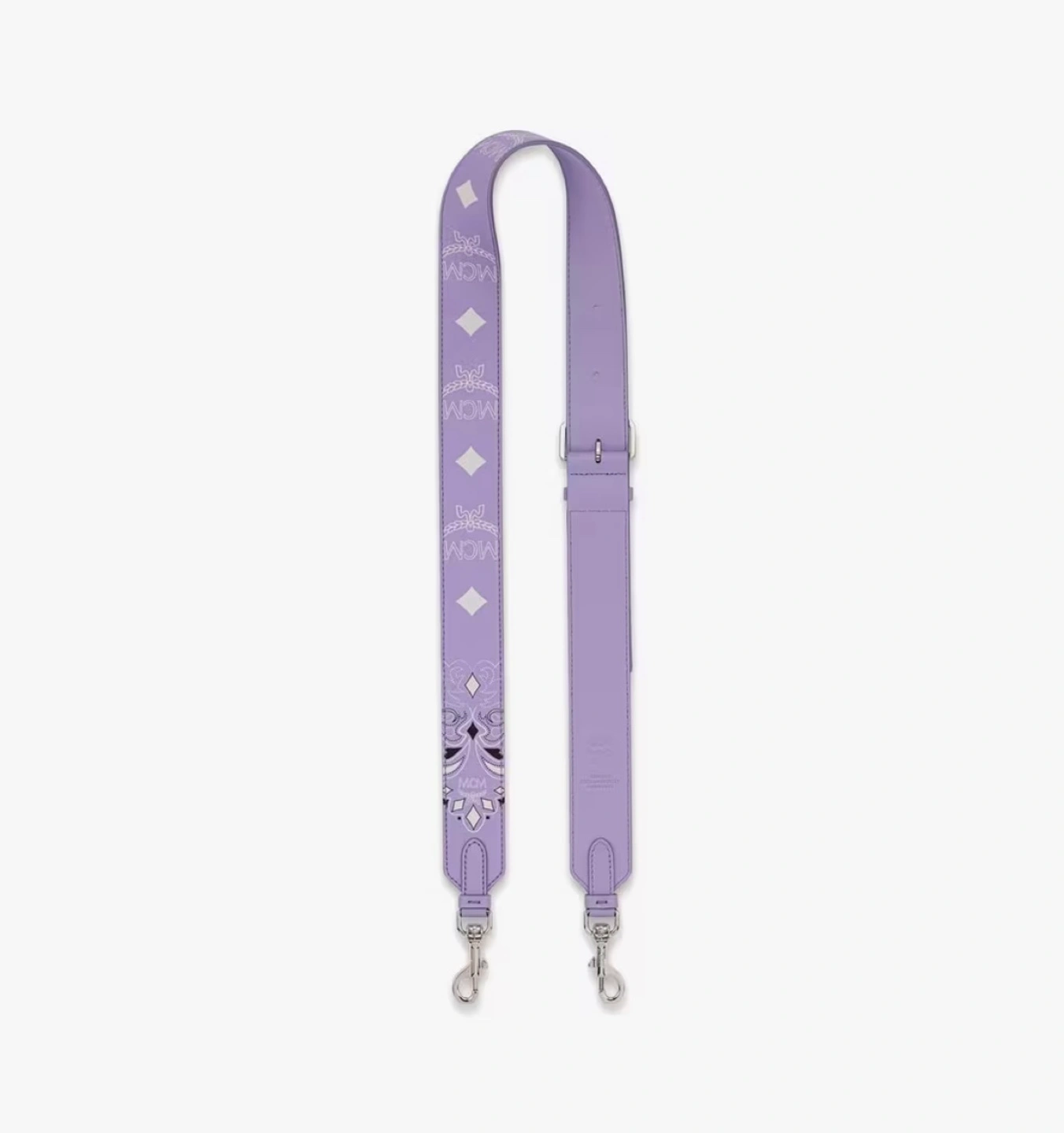 Genuine MCM crossbody bag strap. Lavender purple leather. Features MCM logo. Silver-toned hardware. Adjustable length.