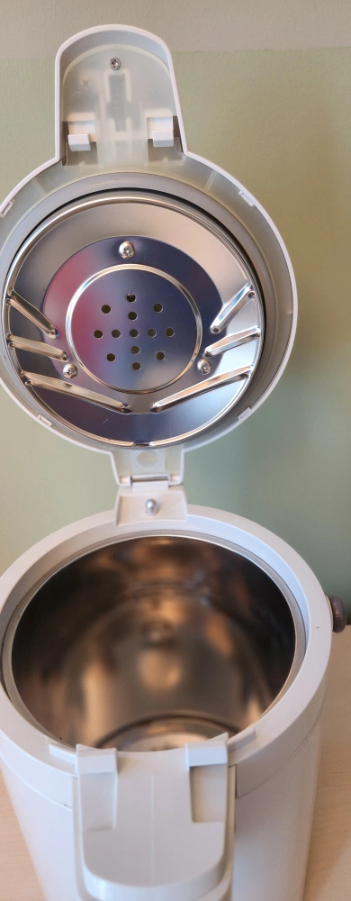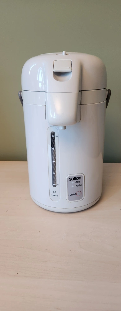 White electric water dispenser. Boil and warm settings. 3 litre capacity. Stainless steel interior. Minor staining inside.