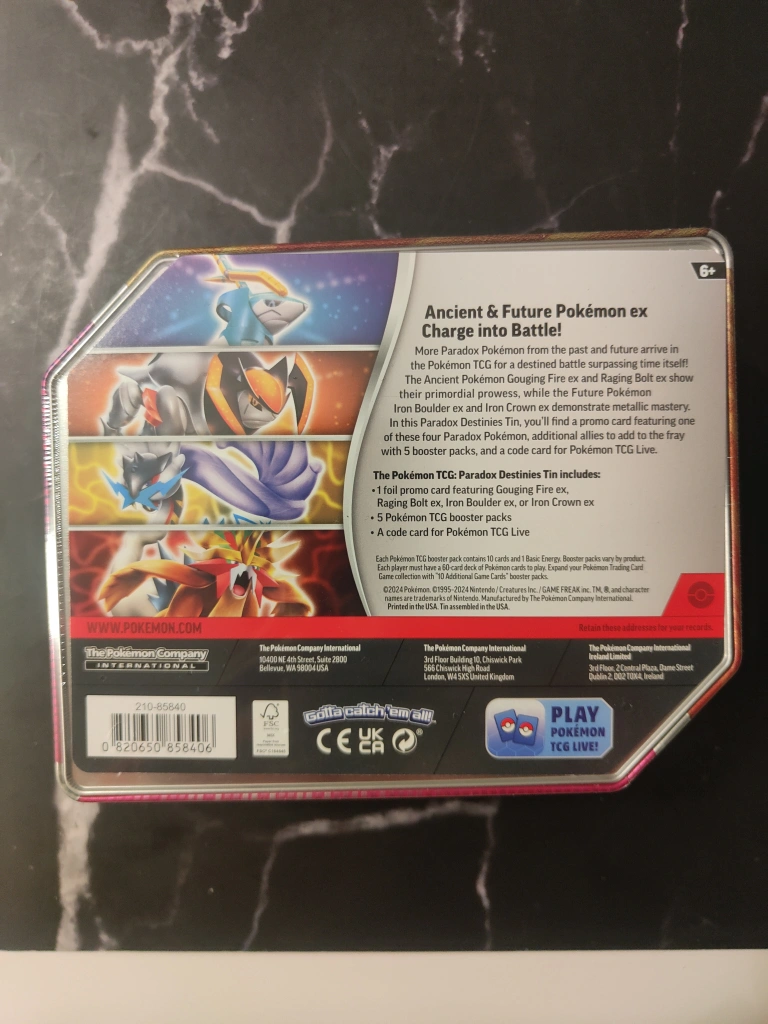 Sealed tin of Paradox Destiny Gouging Fire EX promo, plus a combination of 5 booster packs of Paradox Rift, Temporal Forces, Twilight Masquerade, Obsidian Flames. Pickup anywhere in the GTA as long as it is near a TTC station.