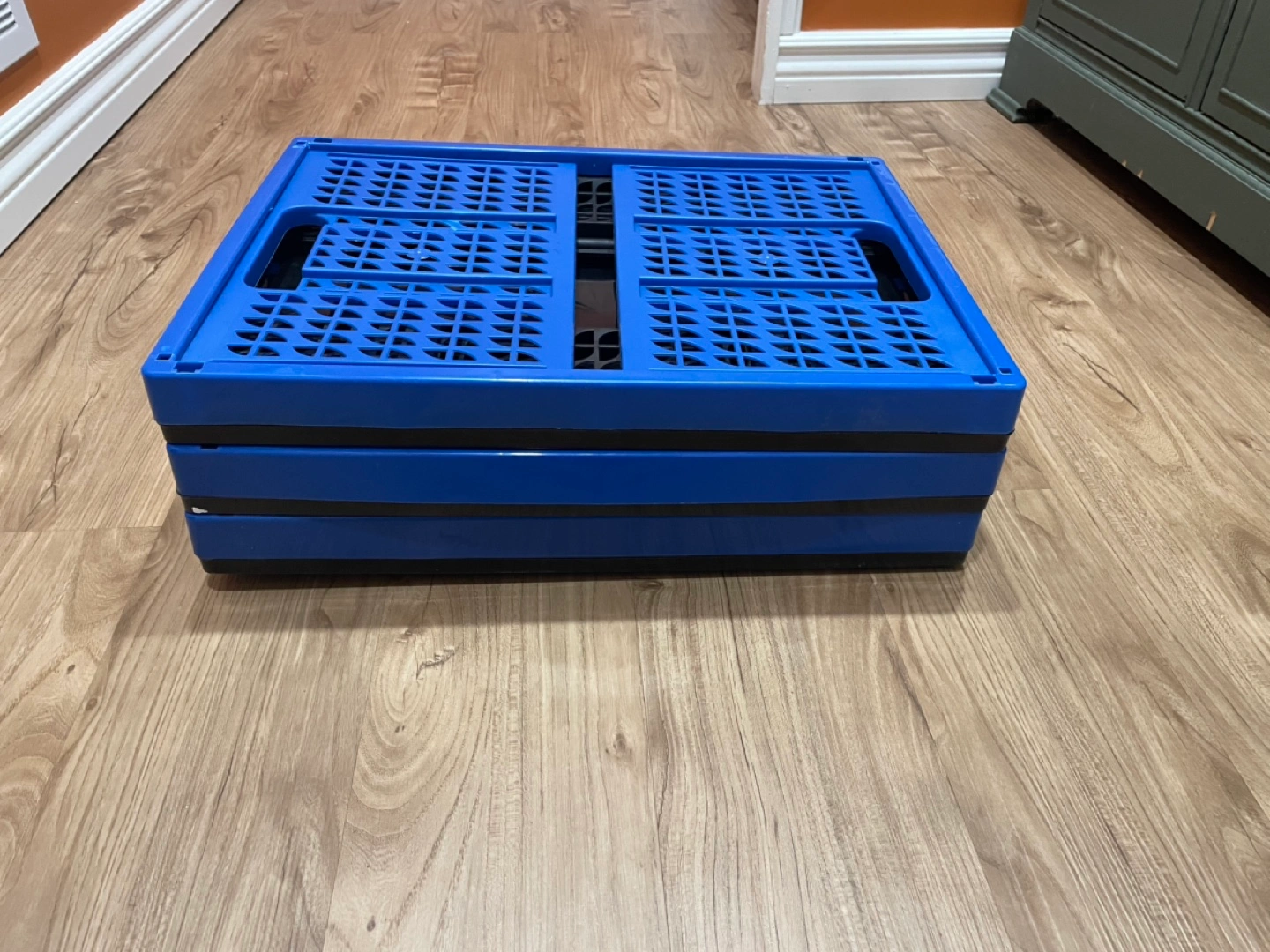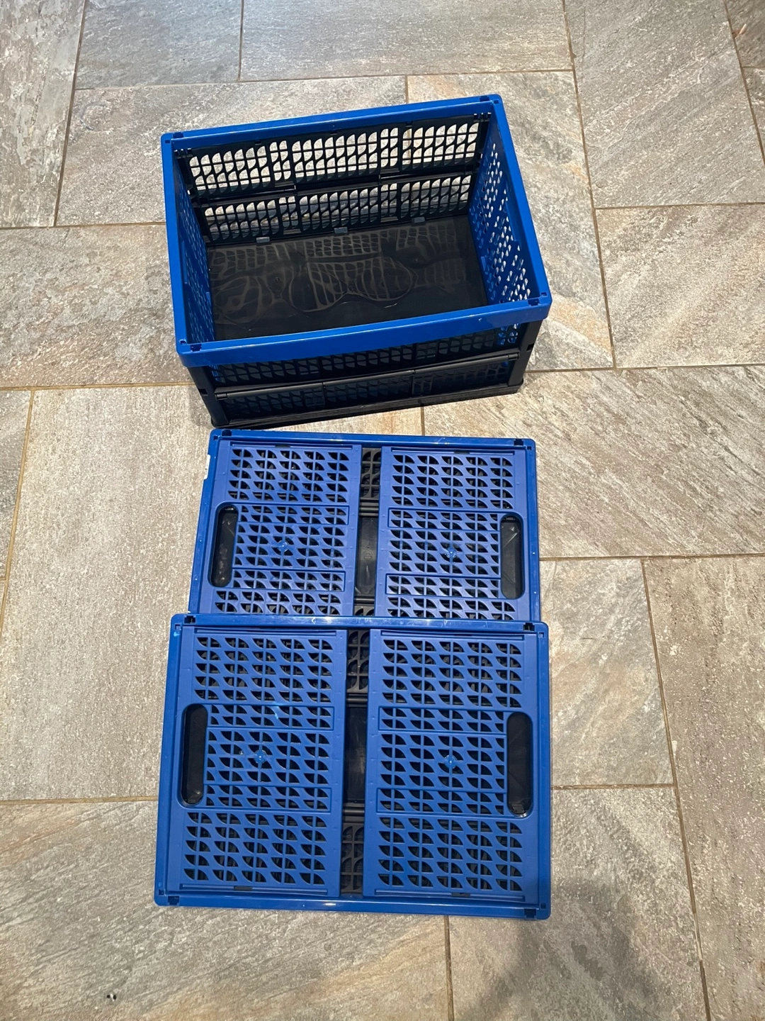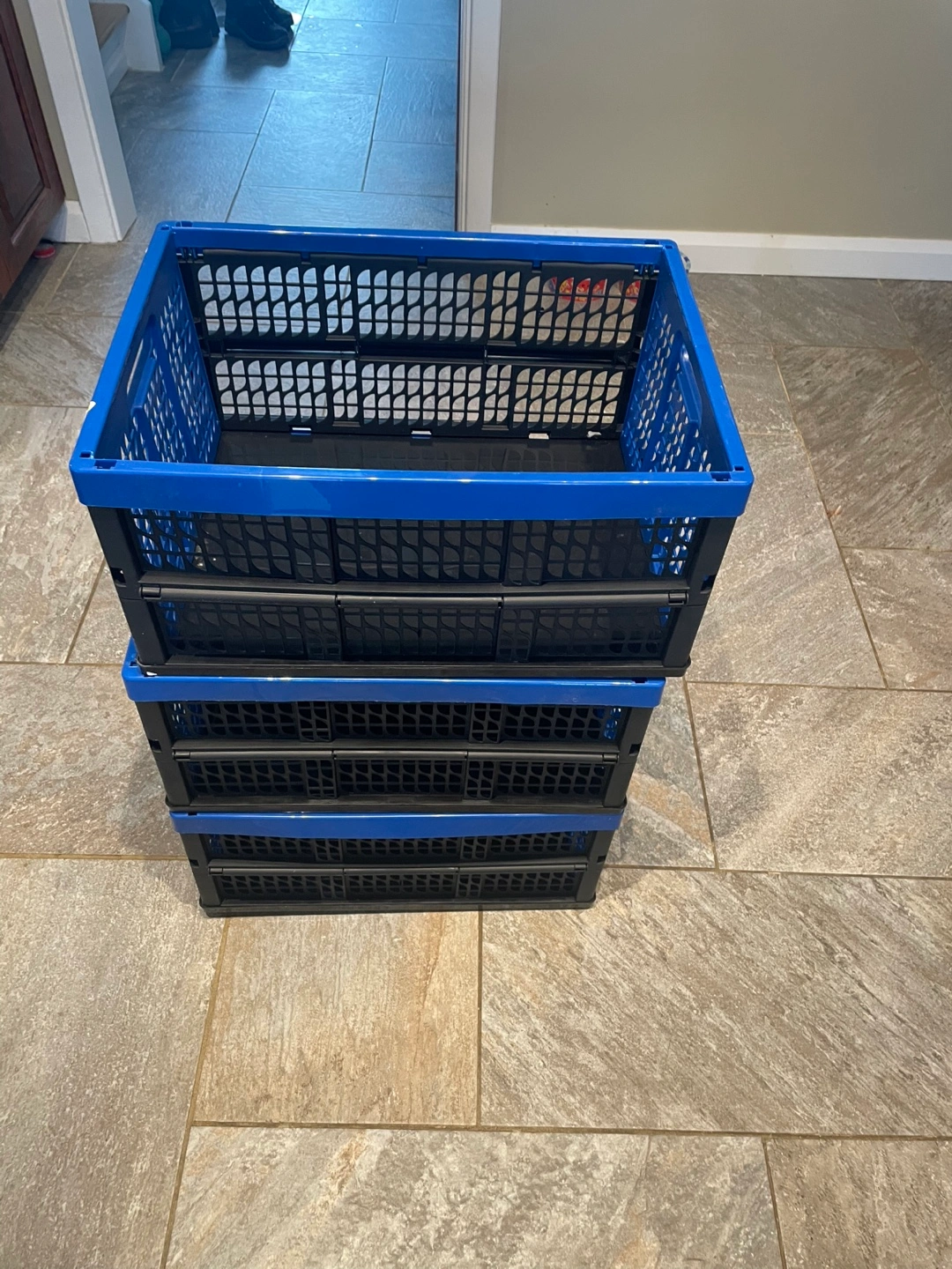 Three blue plastic storage containers. Collapsible for easy storage. Great for organizing or moving.