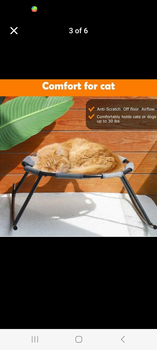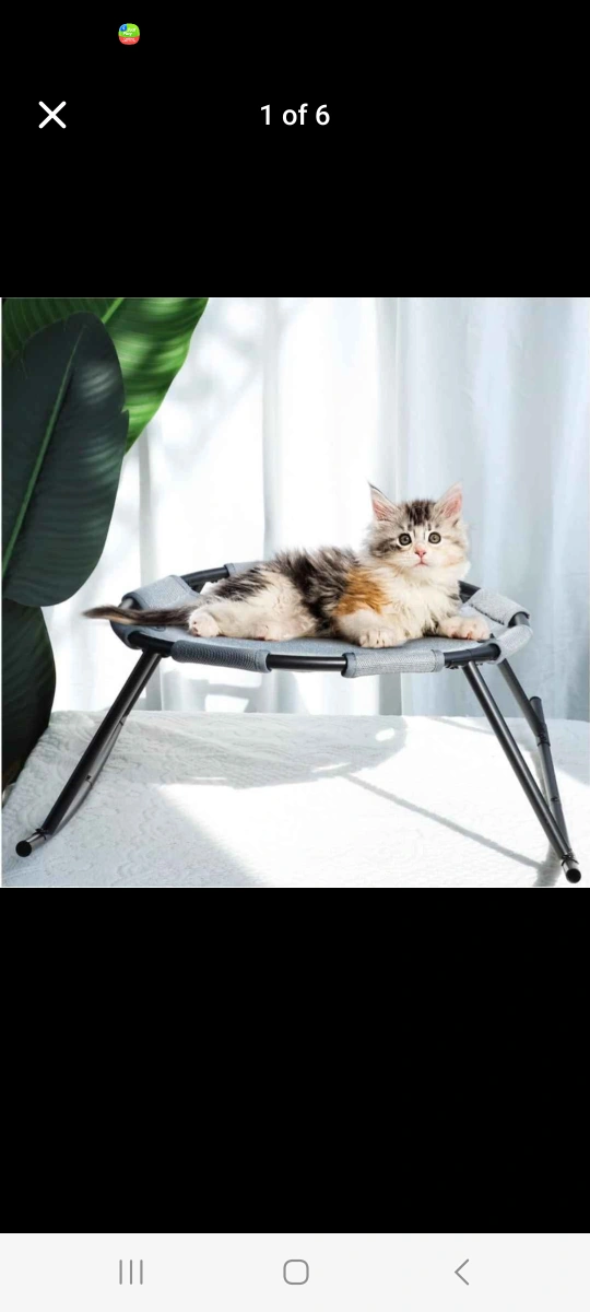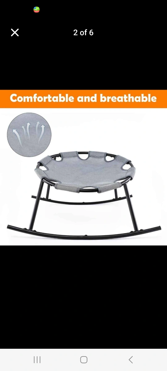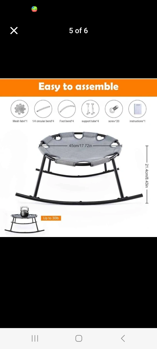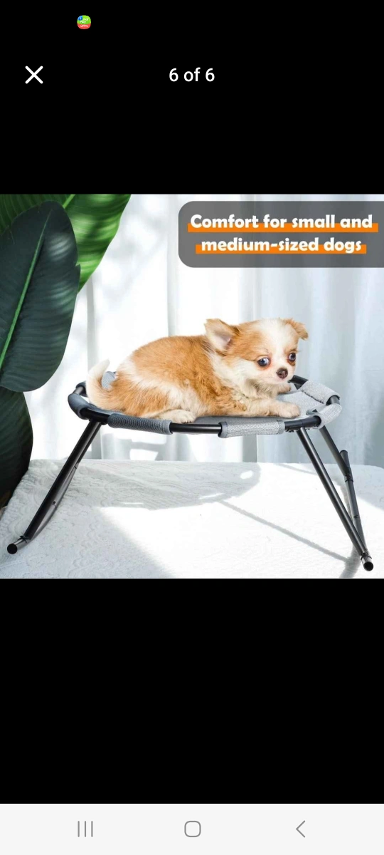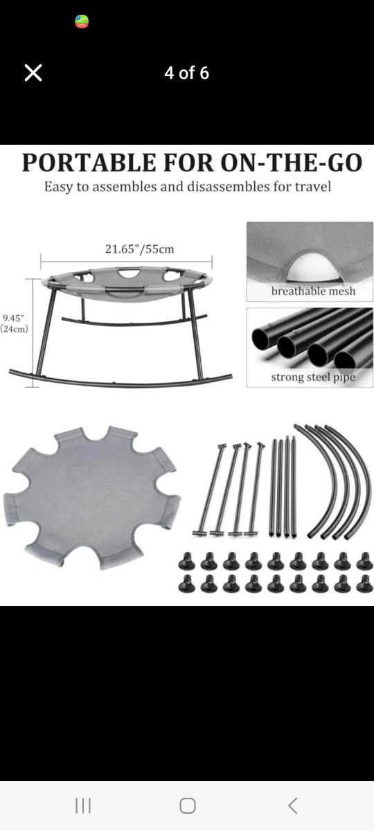 Grey breathable mesh pet bed. Supports up to 30 lbs. Easy assembly and disassembly. Portable design, great for travel. Strong steel frame. Anti-scratch.