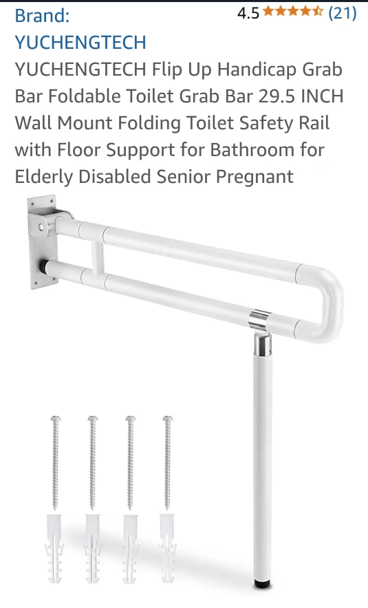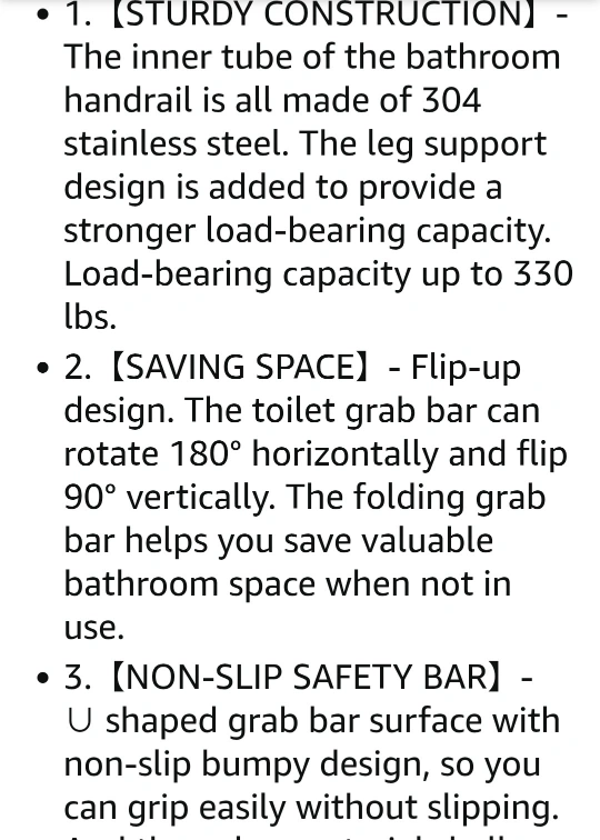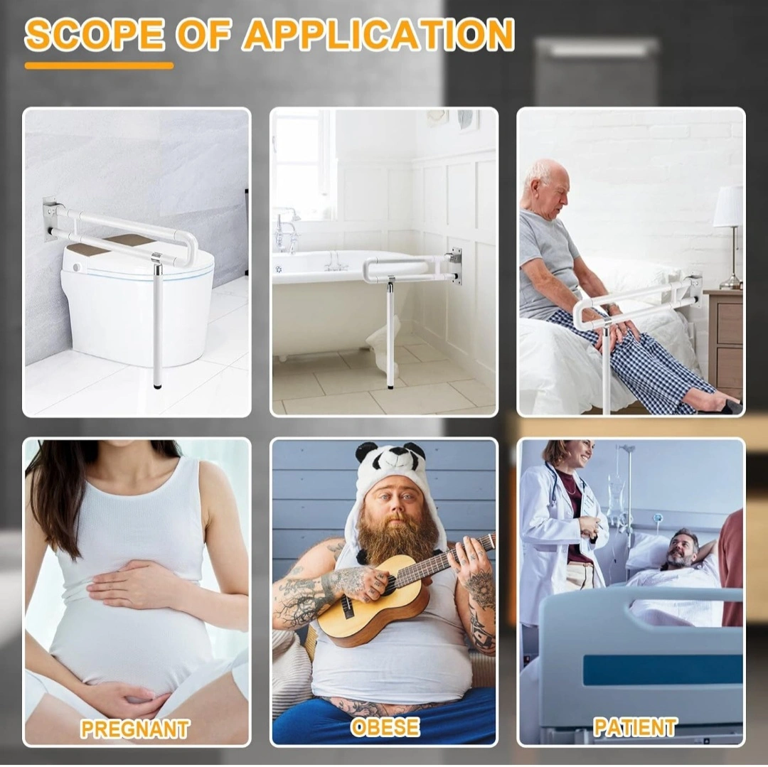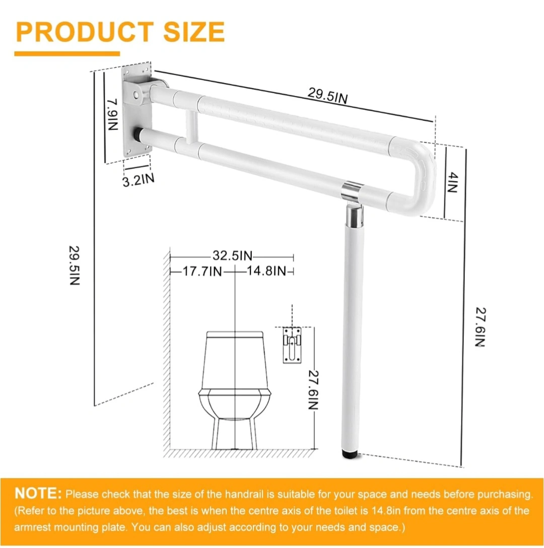 Good Quality FOLDABLE GRAB BAR, for Bathroom Safety. Wall Mounted with Floor Support. 29.5 inch. Suitable for Seniors, Pregnant people, and Patients. Folds Up for SPACE SPACING. Fluorescent Features, easily Seen in The Dark. Simple Folding operation.(See pictures for Dimensions)