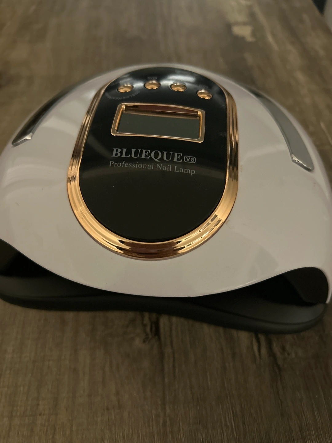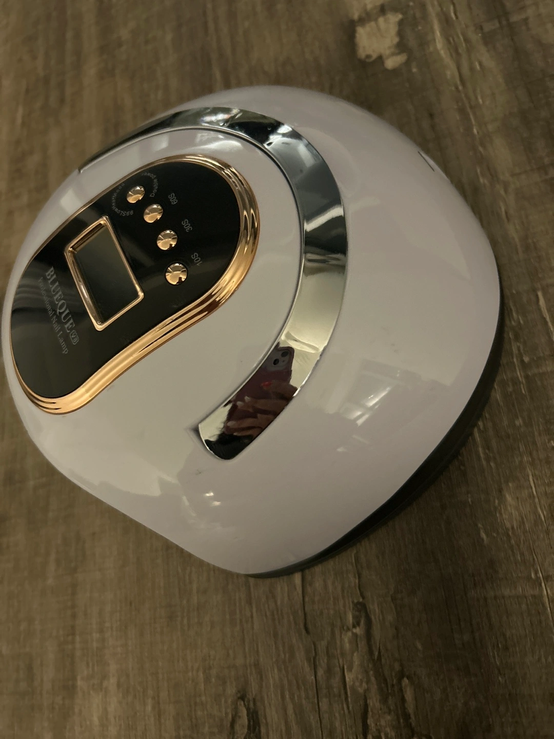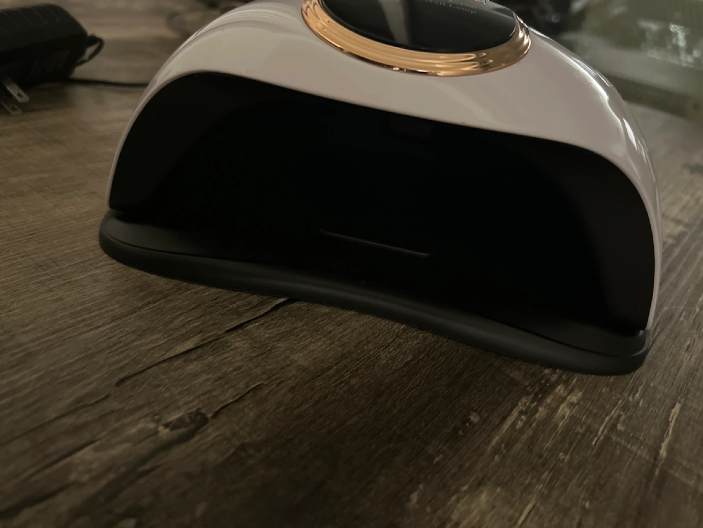 Used nail lamp. White and rose gold. Includes power adapter. Digital timer. Great for at-home manicures.
