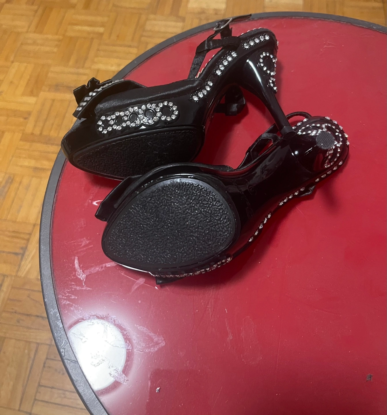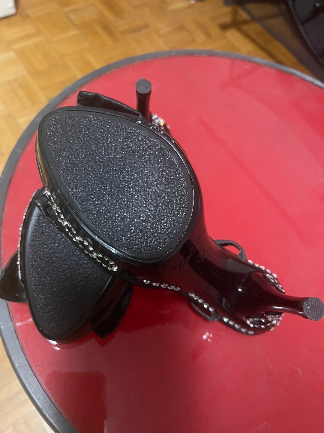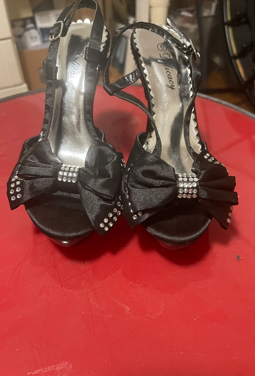 Elegant black high heels. Features a satin bow adorned with rhinestones. Ankle strap closure. Rhinestone detailing on the heel and straps. Perfect for special occasions.