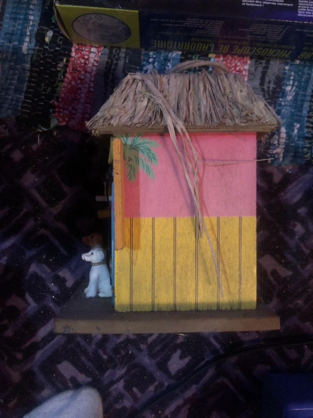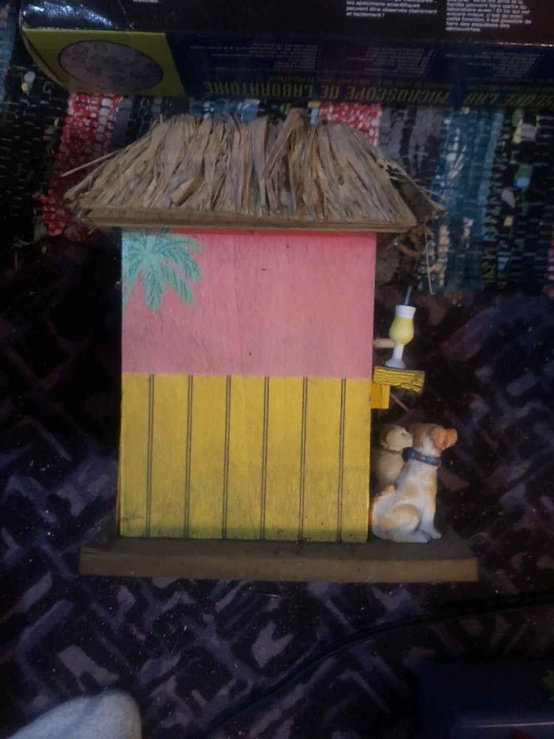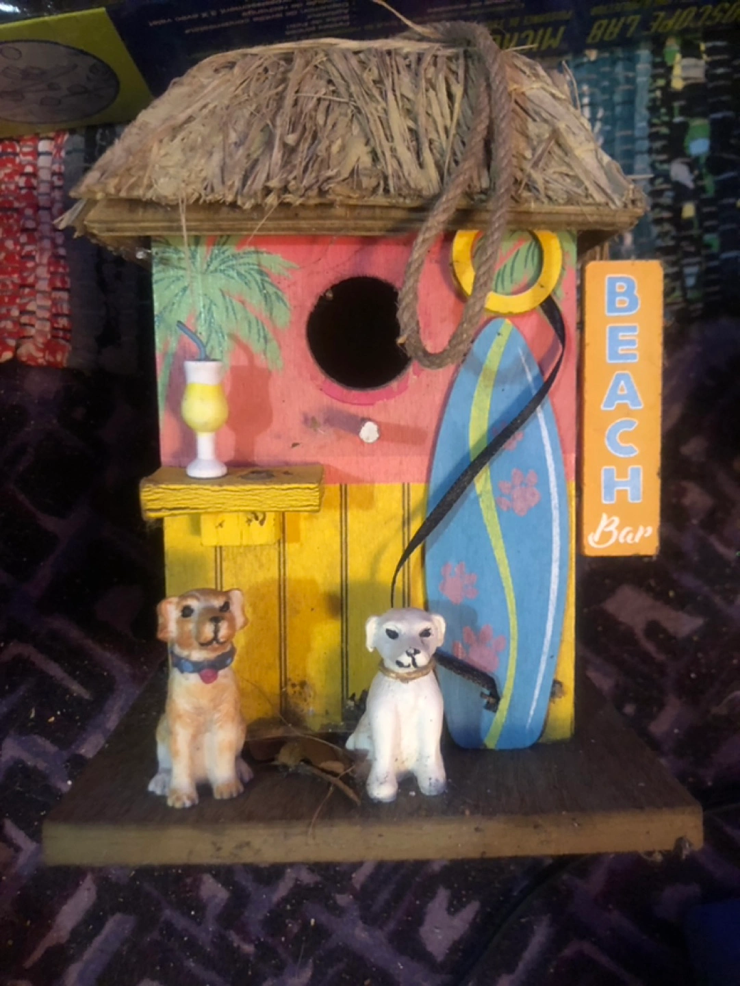 Unique birdhouse shaped like a beach bar. Features a thatched roof, palm tree, bar surfboard, and two adorable dog figures. Perfect for adding a whimsical touch to your garden or home.