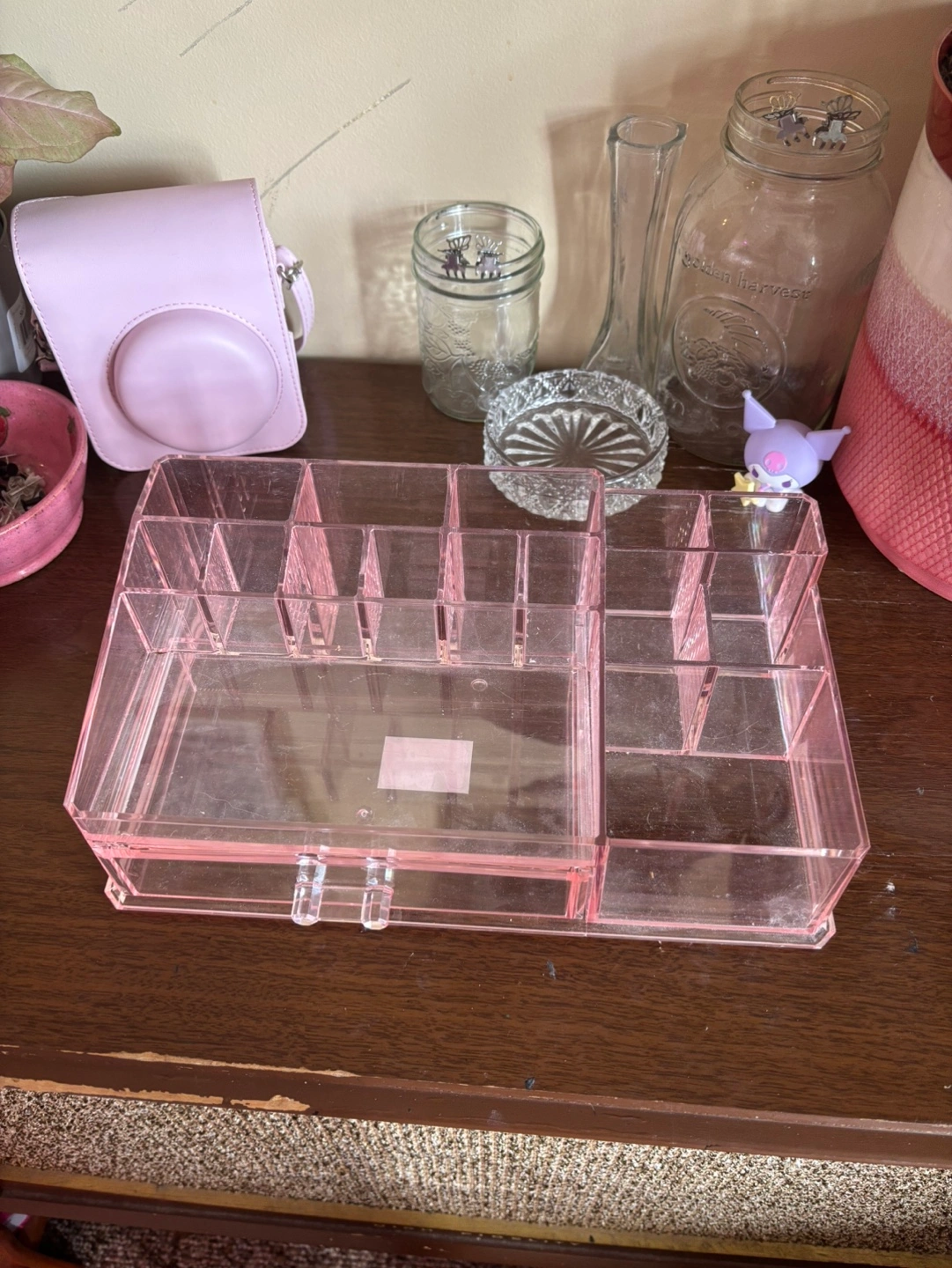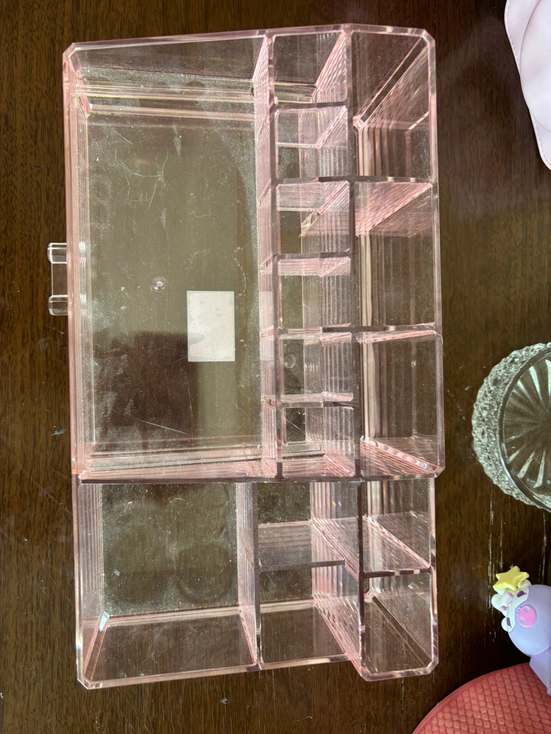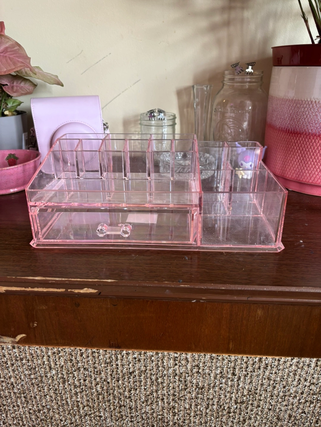 Pink acrylic makeup organizer. Features multiple compartments and a pull-out drawer. Perfect for storing cosmetics and jewelry. Organizes your vanity. some dust but can be cleaned.