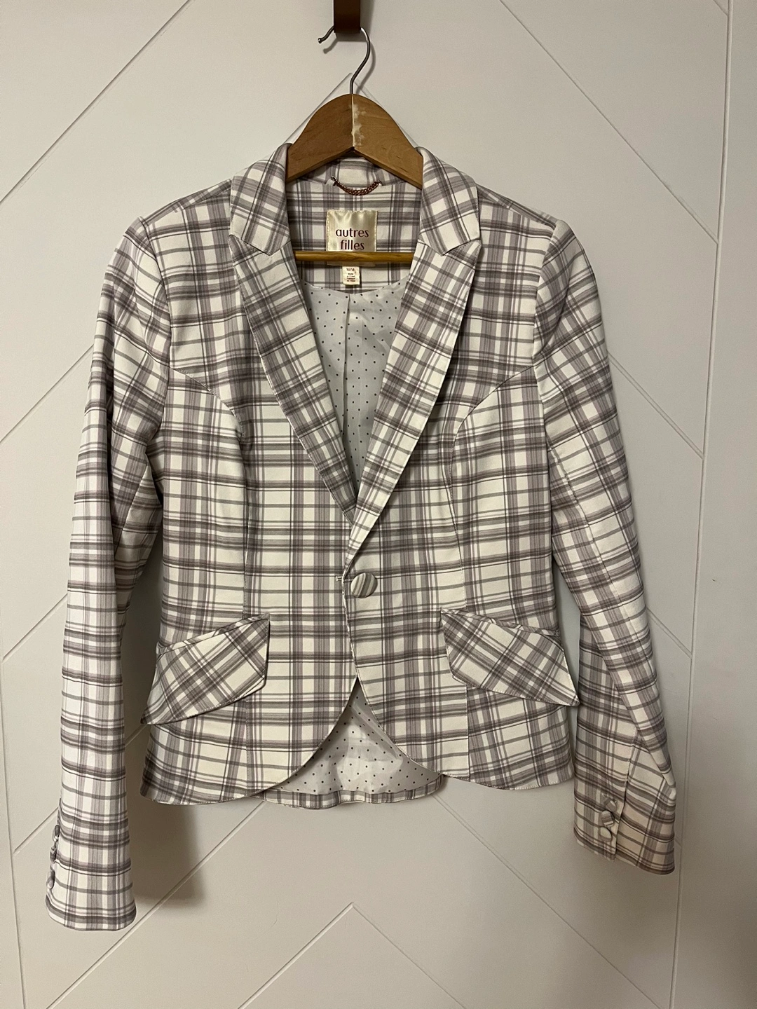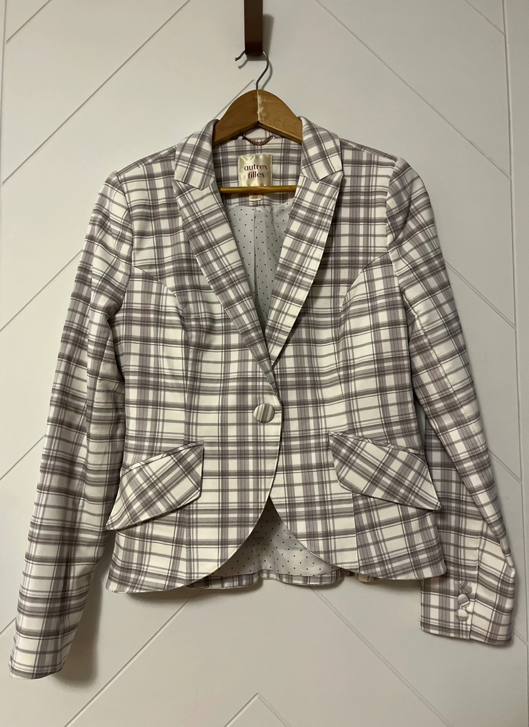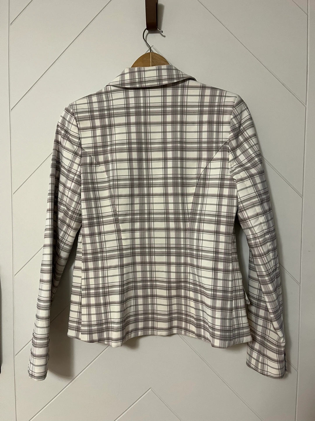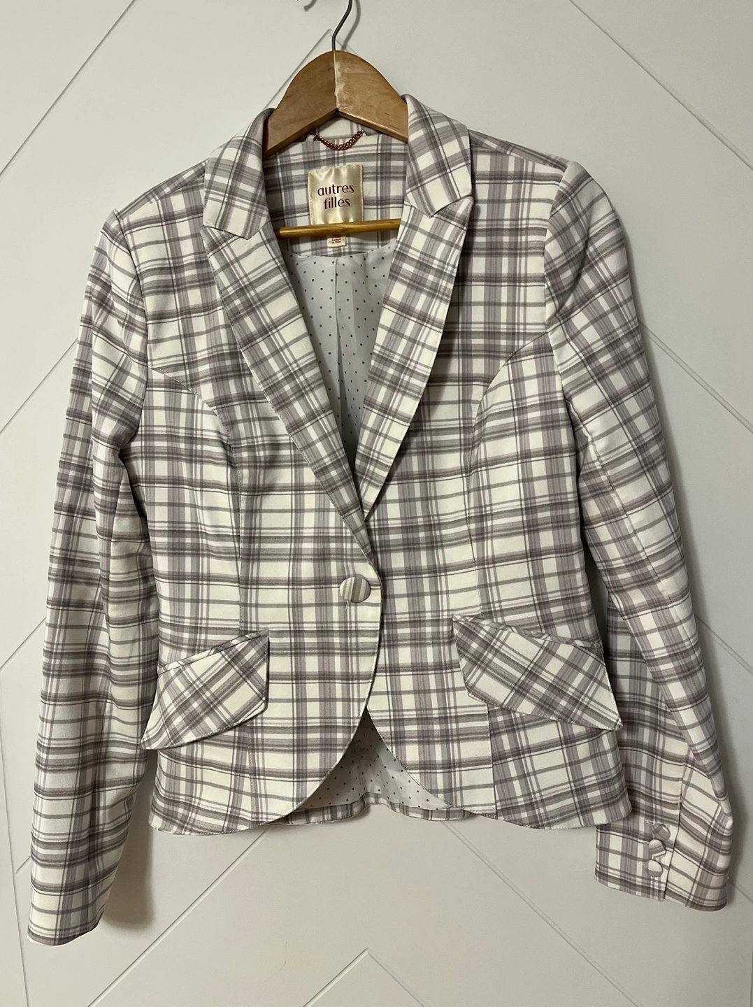 Women's blazer jacket Cream and grey plaid pattern Single-breasted Size medium Pick up Bloor and Islington Etobicoke