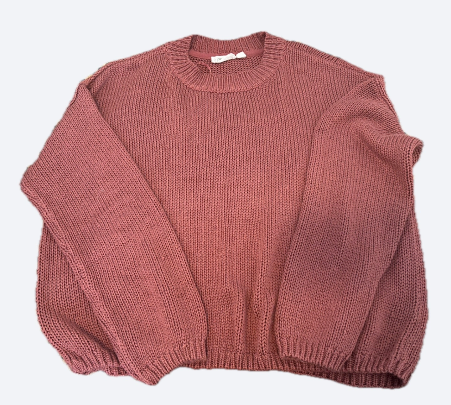 Women's mauve-toned chunky knit sweater. Crew neck. Long sleeves. Relaxed fit. Soft material.