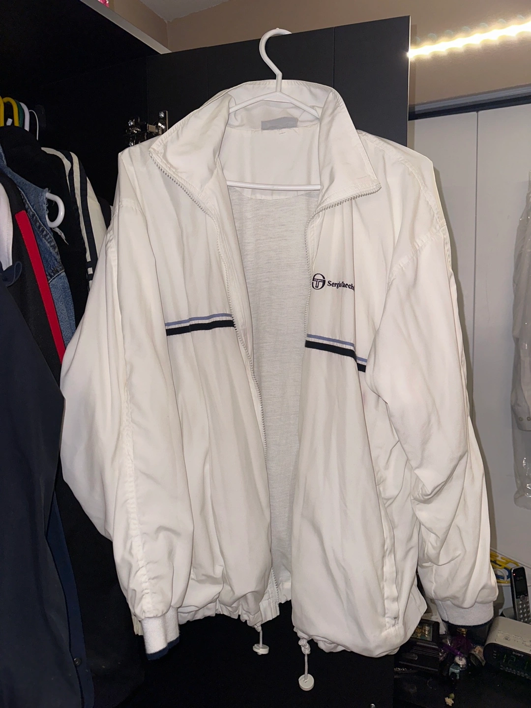 Rare white vintage Sergio Tacchini windbreaker jacket Medium but can fit a large Like new condition Has drawstrings to tighten the bottom