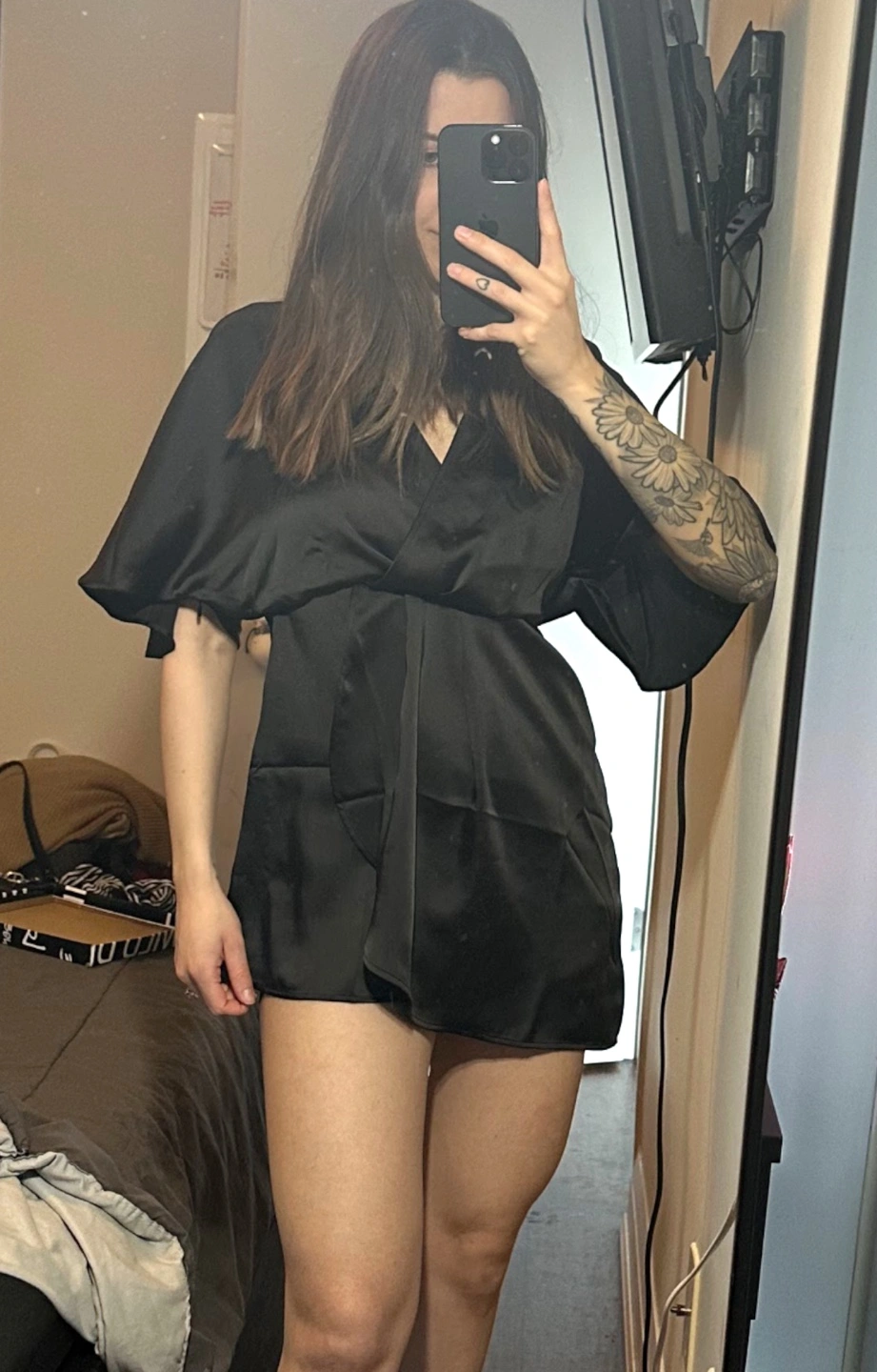 Silky satin material. Wrap style. Short sleeves. used last Christmas only