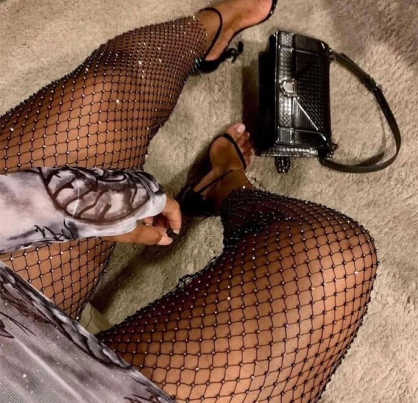 Stunning black fishnet pants with sparkly rhinestones. Elastic waistband. One size