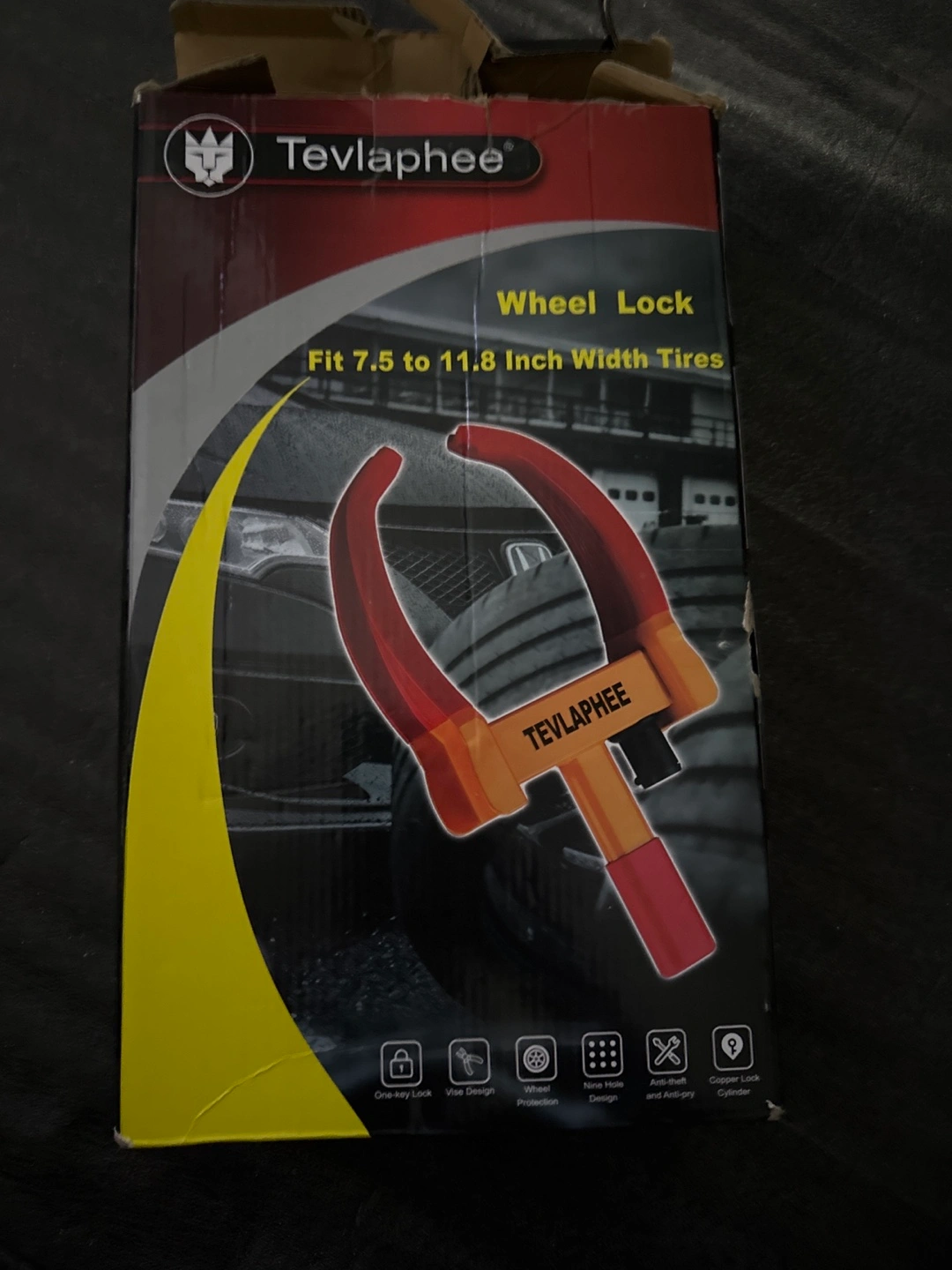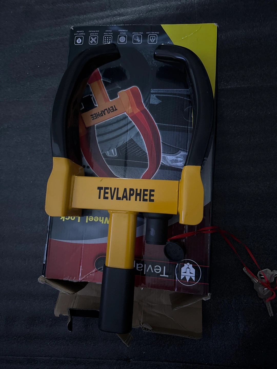 New wheel lock. Fits 7.5 to 11.8 inch wide tires. Includes keys. Durable design. Heavy-duty construction.