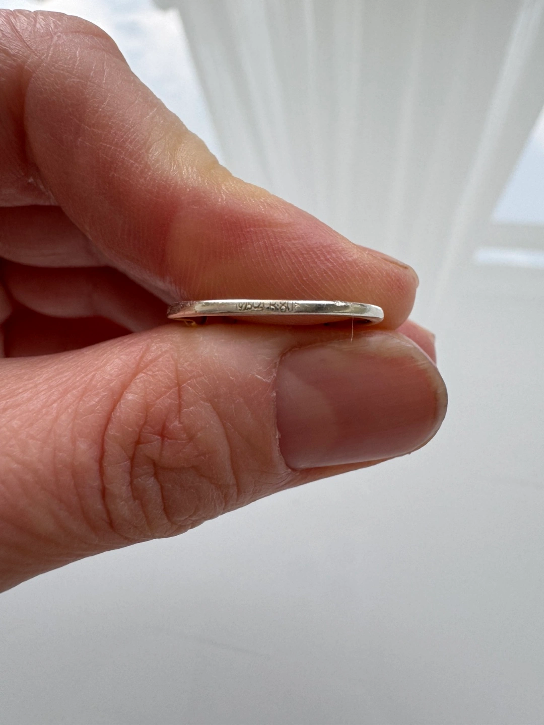 Simple gold plated sterling silver band ring. Features small, colourful gemstones. Subtle and elegant design. Perfect for everyday wear. Please note one of the stones fell out but could be replaced. I initially purchased this to wear on my pinky finger but it is too loose. It was too expensive to replace the stone and tighten it as well. Purchased in Barcelona, Spain from an antique market.