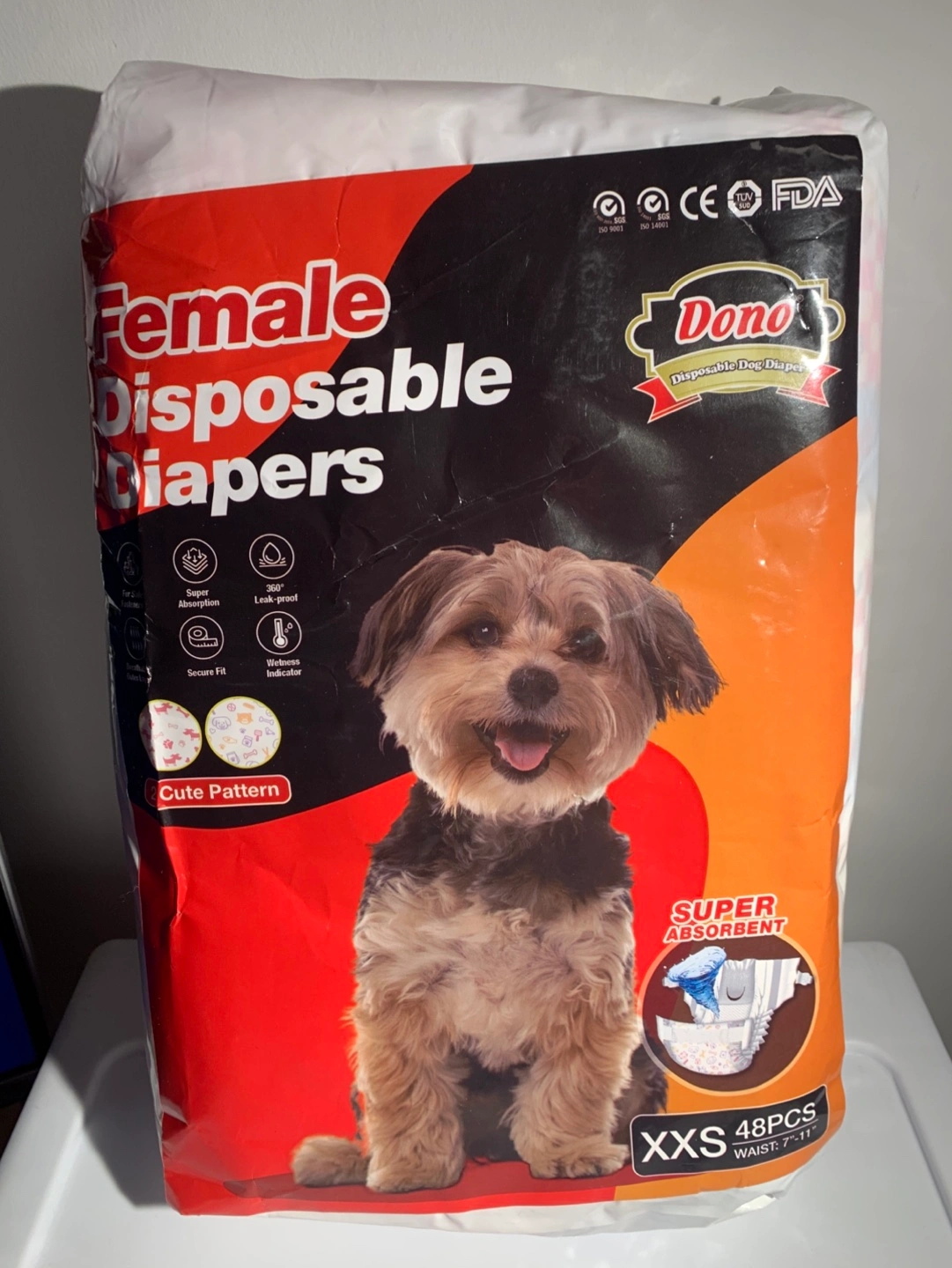 $15 Firm. Selling for a friend. New, unopened package of Dono brand disposable dog diapers. Size XXS, fits waist 7-11 inches. 48 diapers included. Super absorbent, 360° leak-proof, breathable outer layer, secure fit, wetness indicator, and cute pattern. Fur-safe fasteners.