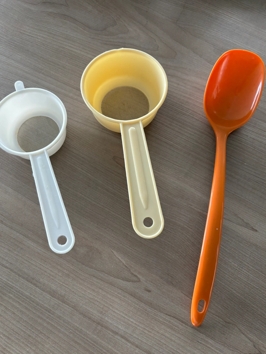 Set of three kitchen utensils. Two small plastic strainers, one white, one pale yellow. One large orange serving spoon. Good condition. Ideal for tea, spices, or serving. Click on my name above and scroll down to see my other listings and pickup locations.