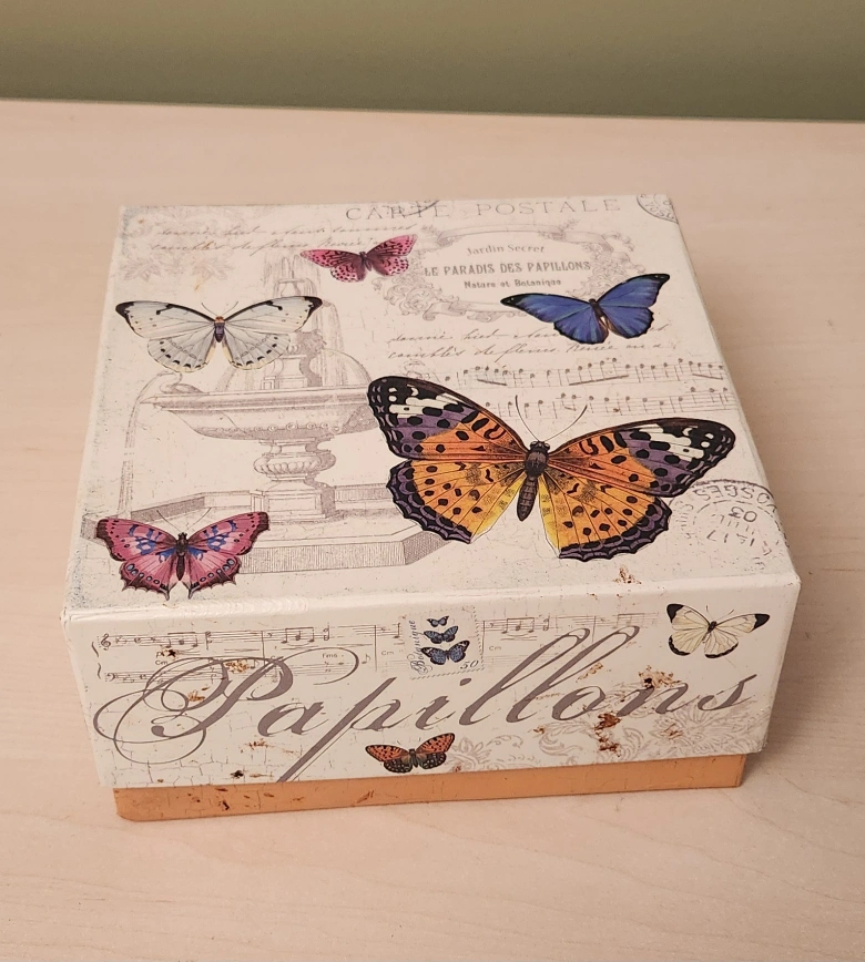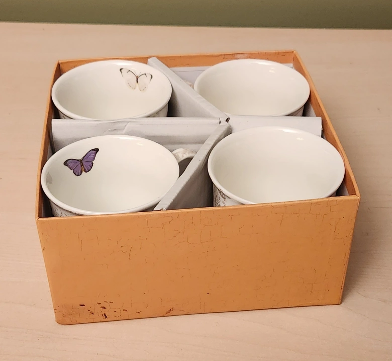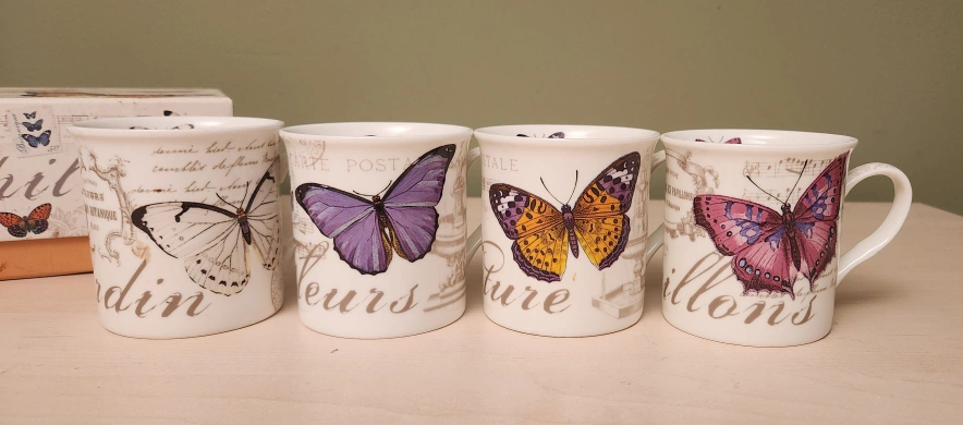 Four bone china mugs. Butterfly design. Presented in a decorative box. Perfect gift.