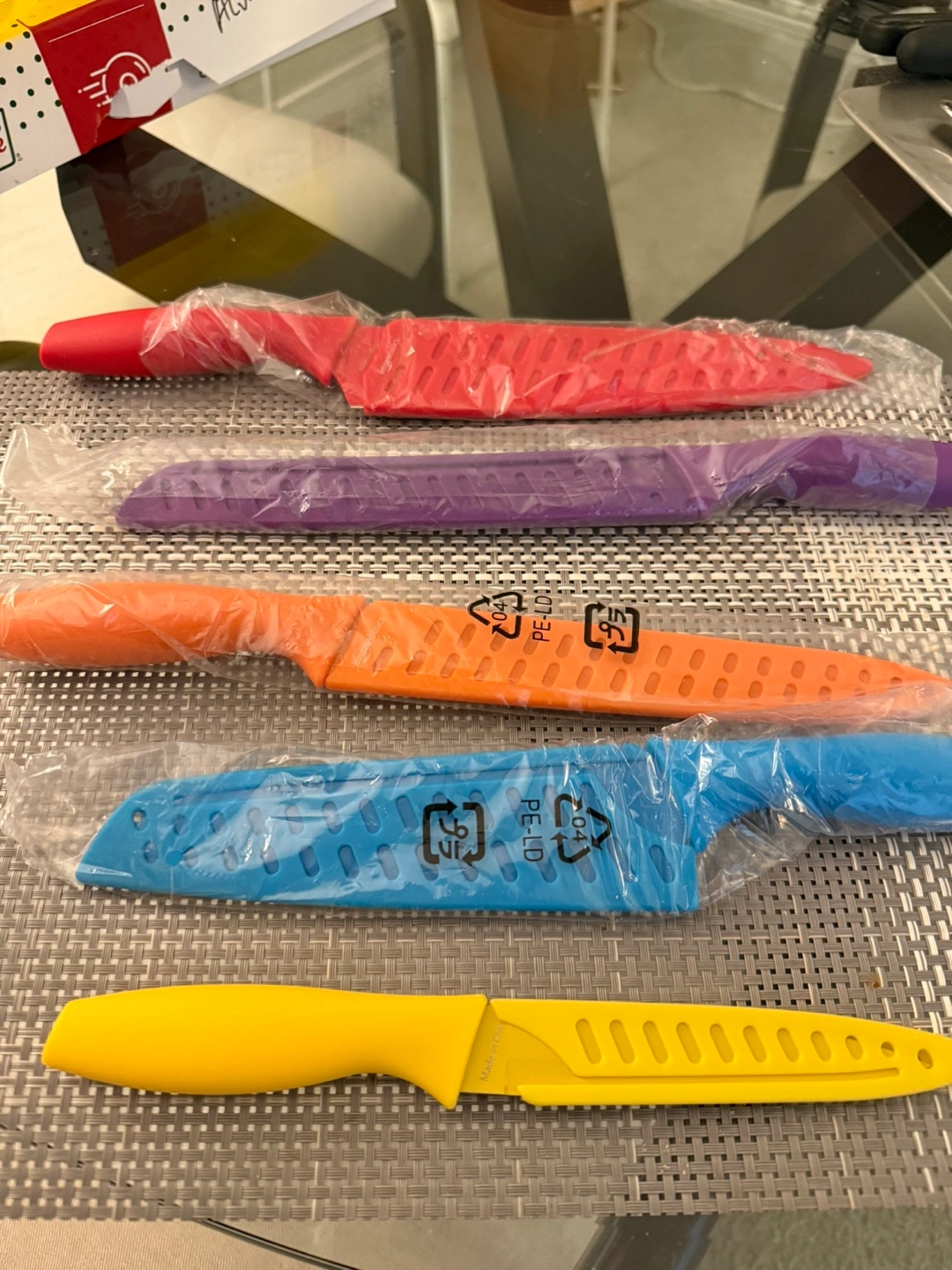 Set of five colourful kitchen knives. Individual plastic packaging. Bright colours. New, unused.