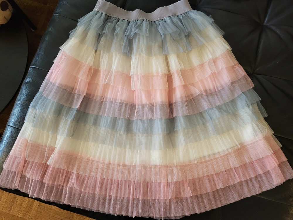 Beautiful layered tulle skirt. Features multiple colours, including pink, grey and white. Elastic waistband. Size 160 / 13-14 years. Brand new. never worn