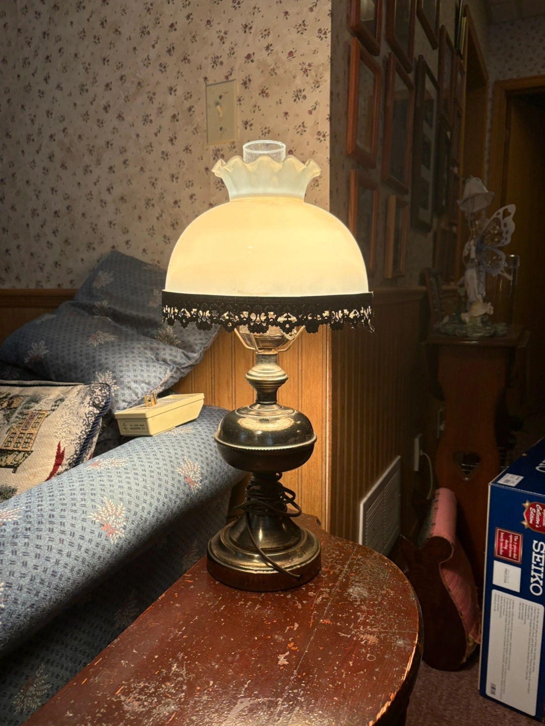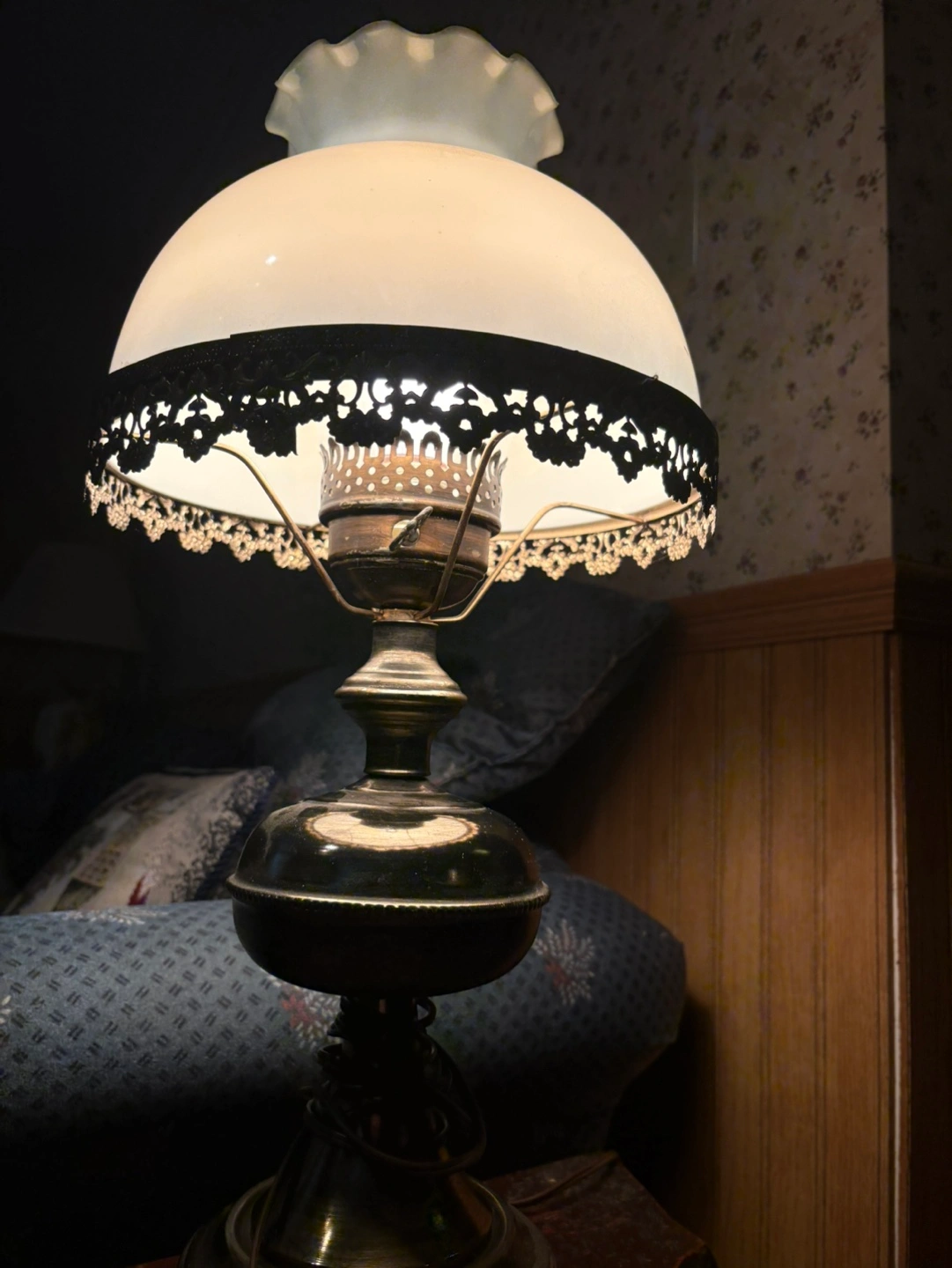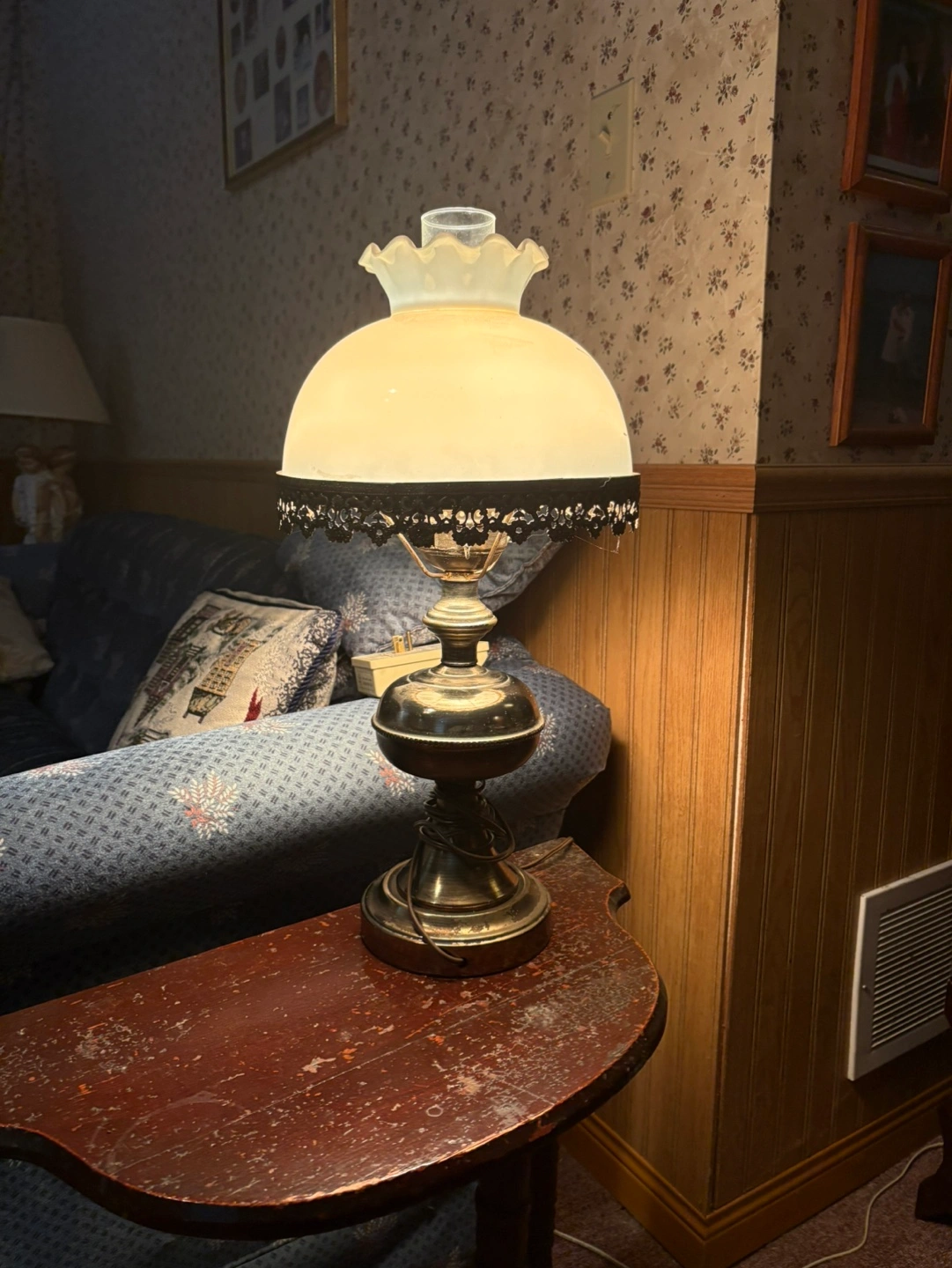 Beautiful vintage table lamp. Features a frosted glass shade with a scalloped edge and decorative metal trim. Brass coloured base (plastic) Excellent addition to any home decor.