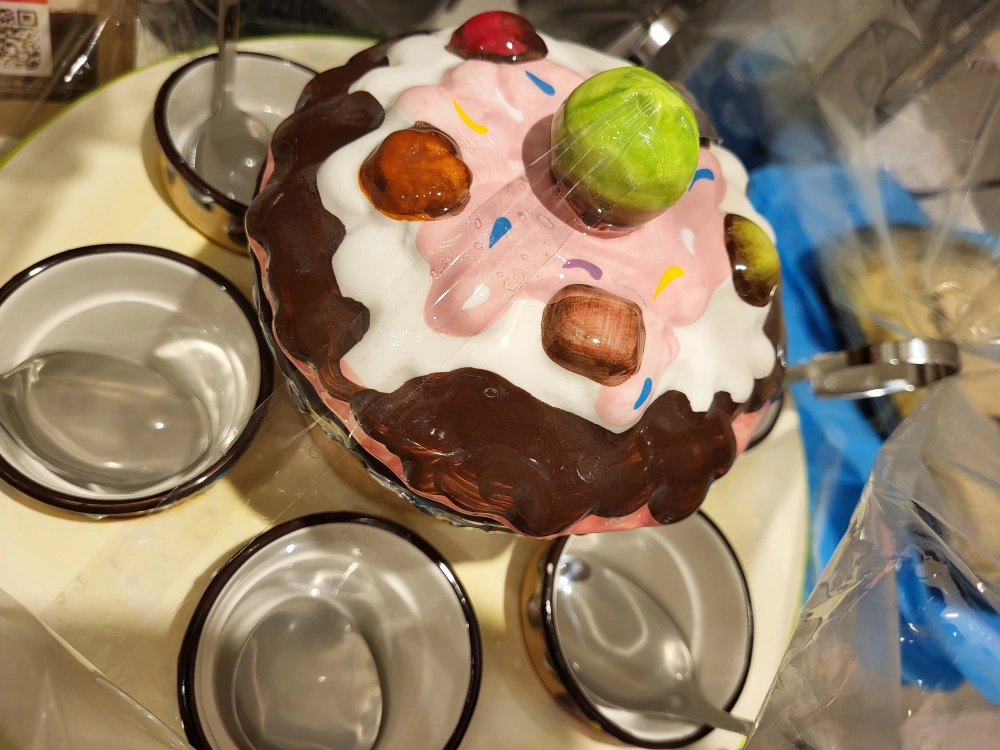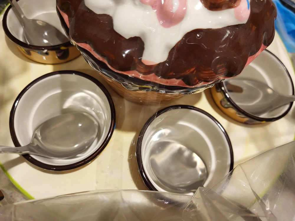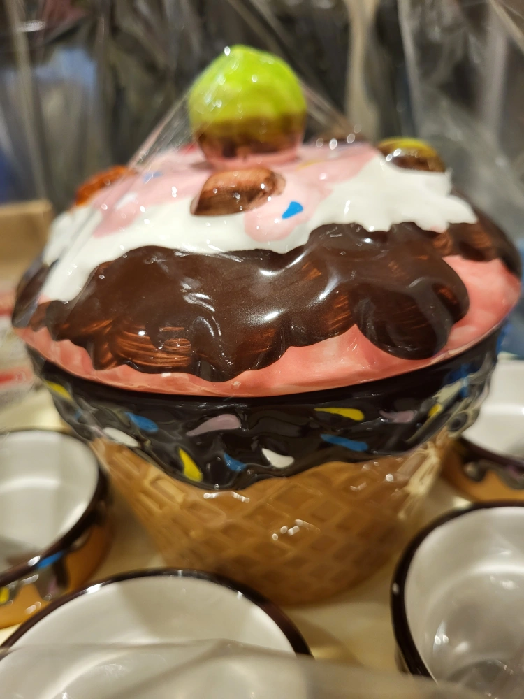 Adorable ice cream sundae serving set. Features a large ice cream cone-shaped bowl and four individual serving bowls. Includes spoons. Perfect for parties or a fun addition to your kitchen. Brand new. Never used.