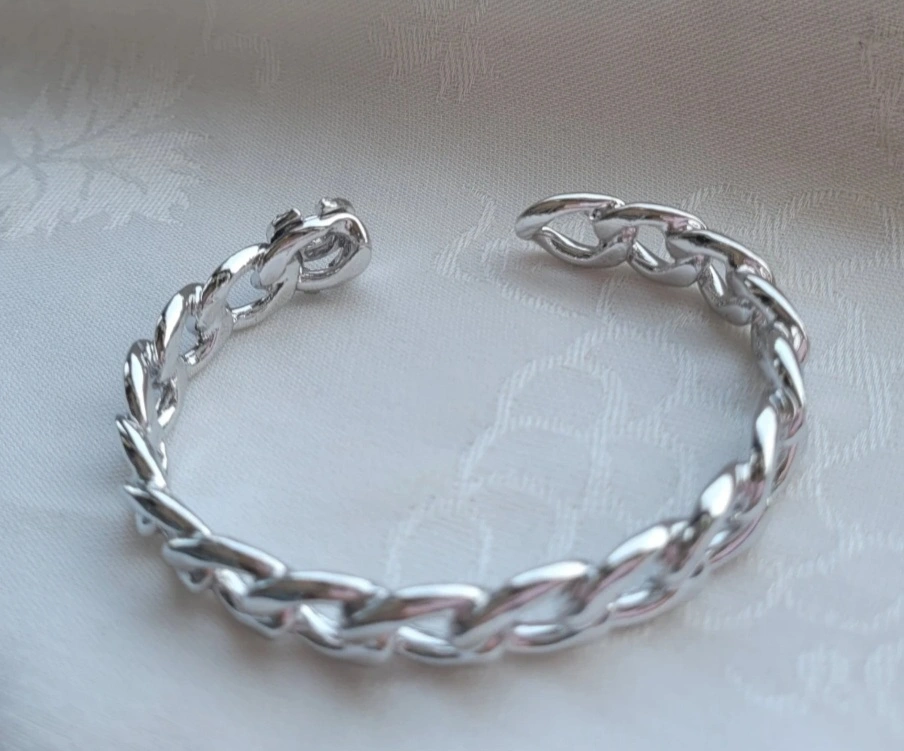 Silver tone metal cuff bracelet. Chain link design. Open style. Looks great with any outfit.
