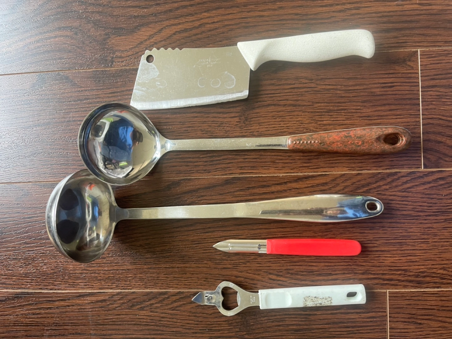 Stainless steel cleaver, two stainless steel ladles, red peeler, and white bottle opener. Great for cooking and serving.