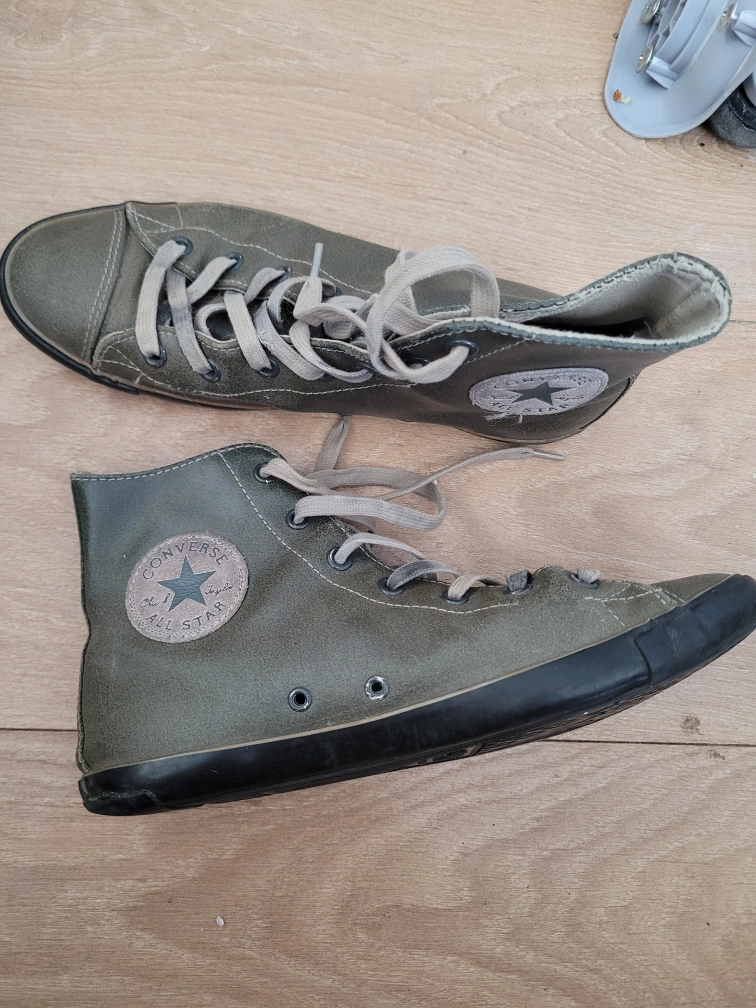 Pair of women's Converse All Star high top sneakers. Military green leather. Minimal wear. Size US 7 ( Super Rare) **** Cash Only **** **** Pickup Only **** **** No E-transfers **** **** Serious Inquiries Only/ Serious Offers Only ****