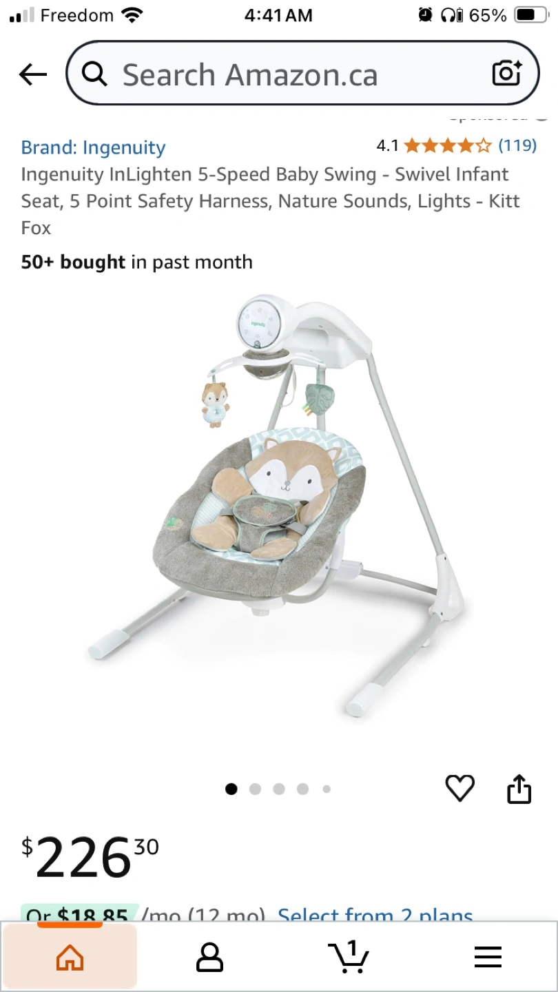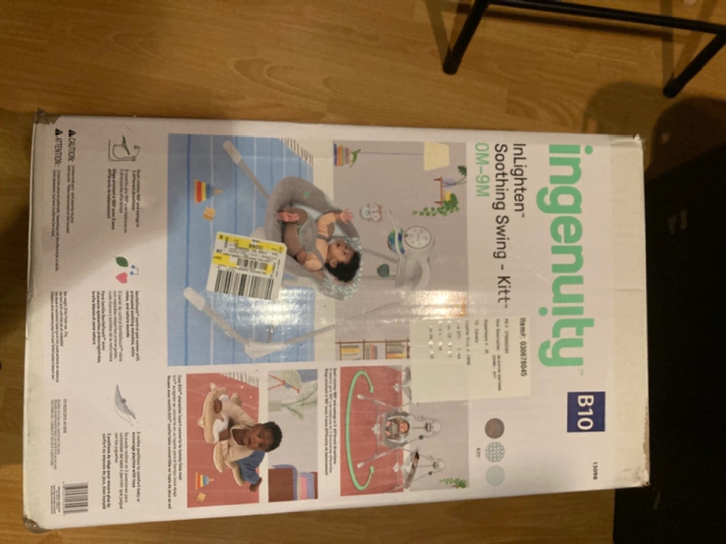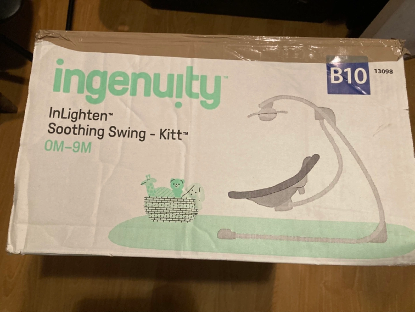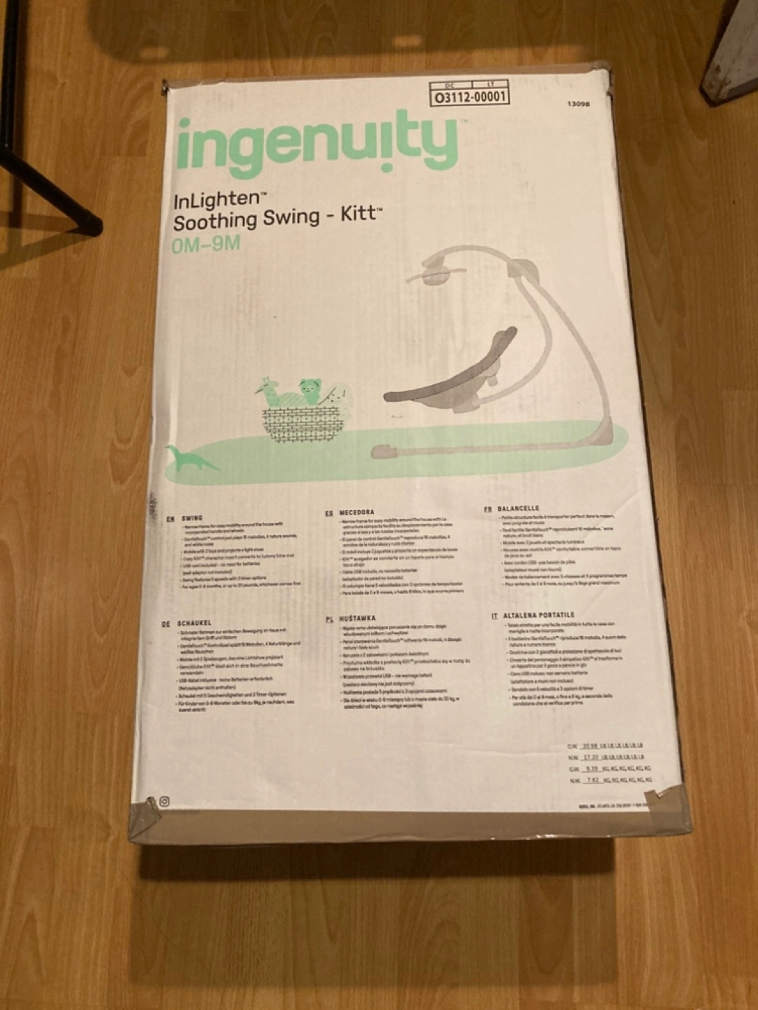 Infant swing, 5-speed, swivel seat, nature sounds, lights. Suitable for 0-9 months. Kitt Fox design. New in box.