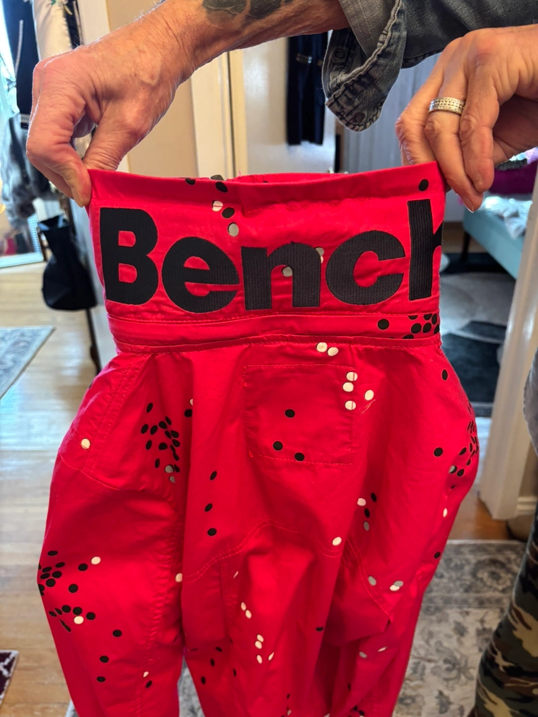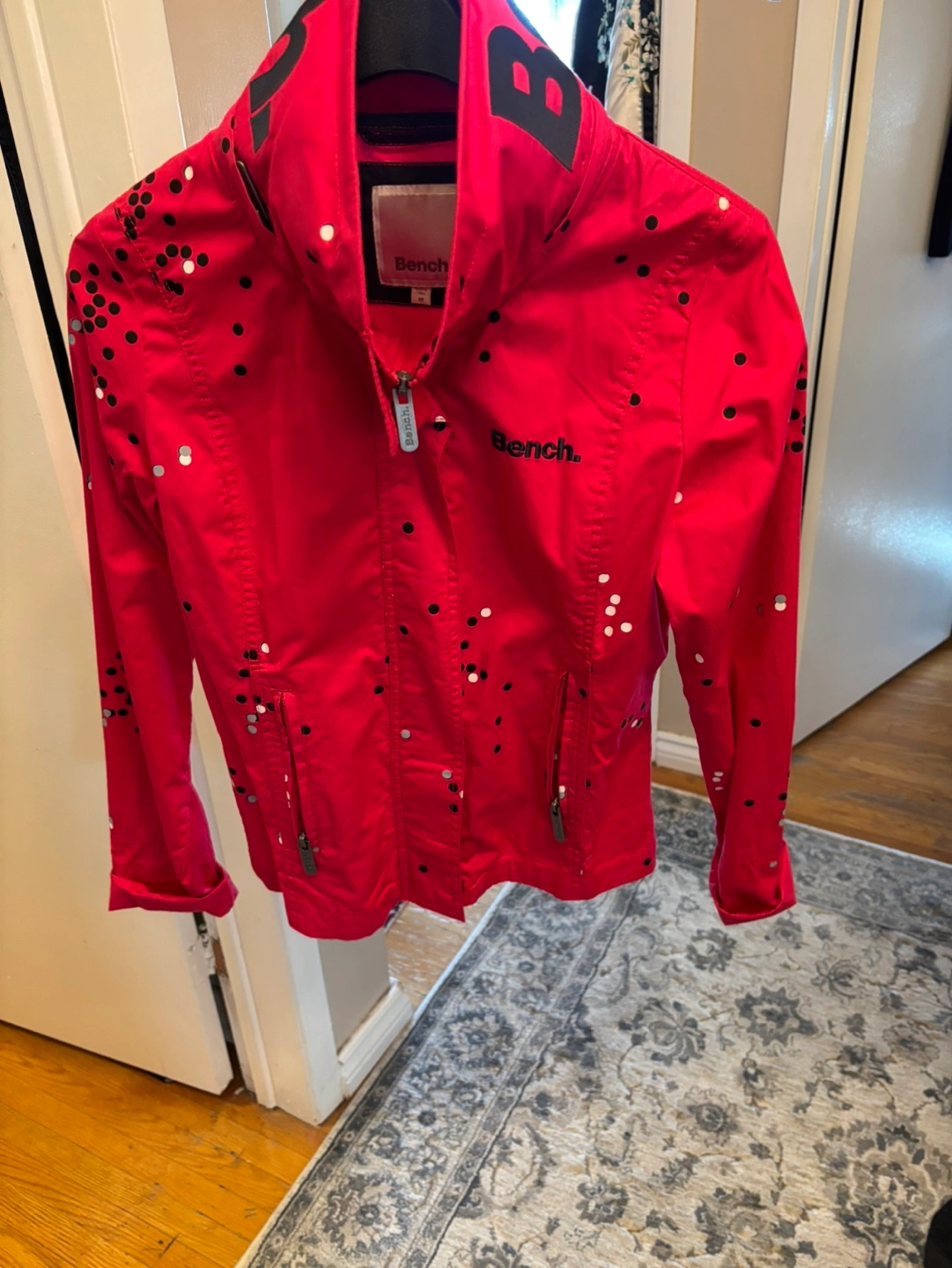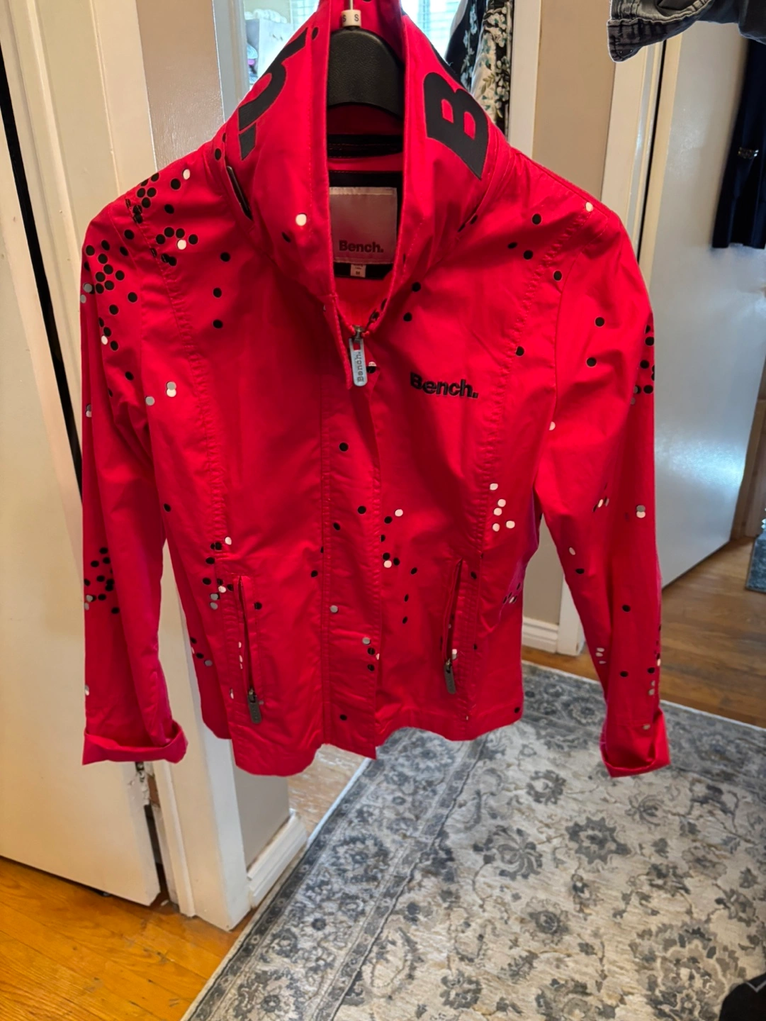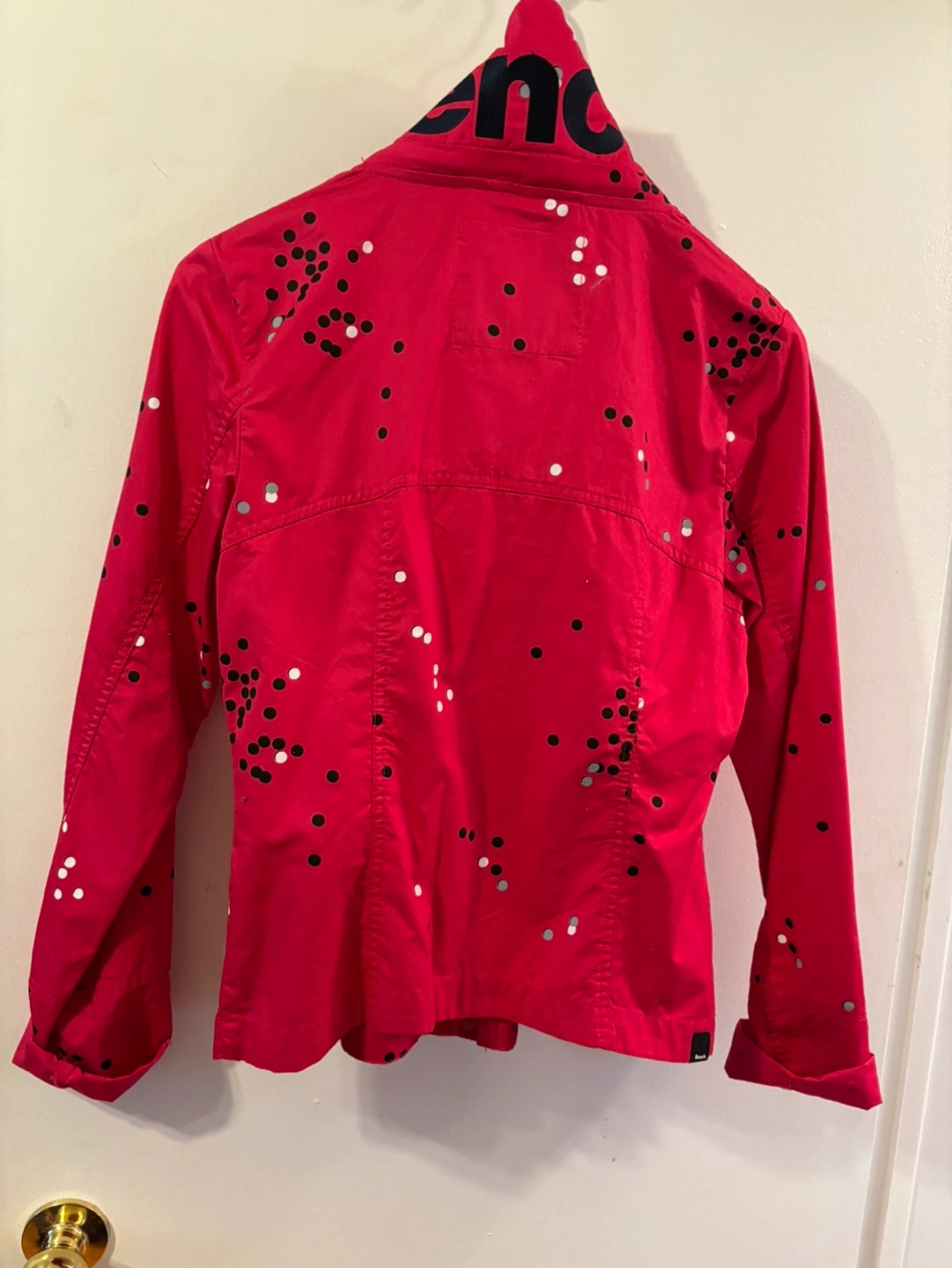Lightweight jacket. Pink colour. Features a dot pattern and Bench branding. Zip closure. Long sleeves. Good condition. This jacket has a hoodie hidden away in the collar !