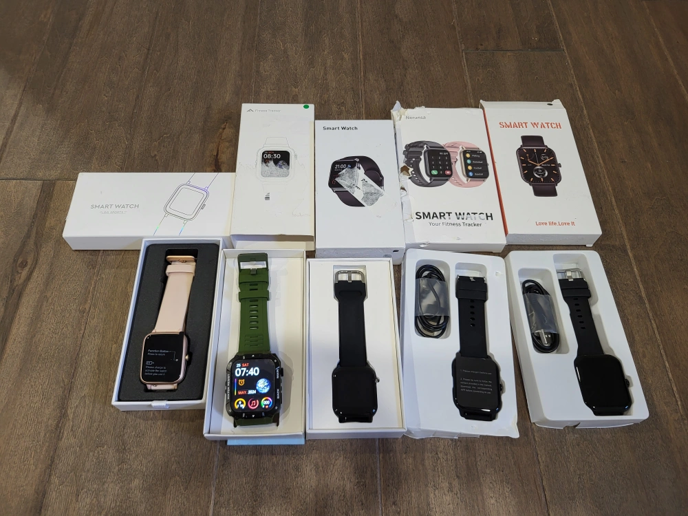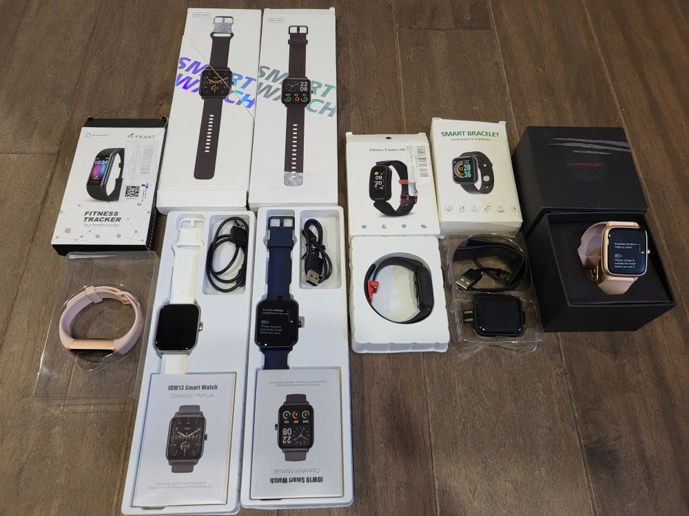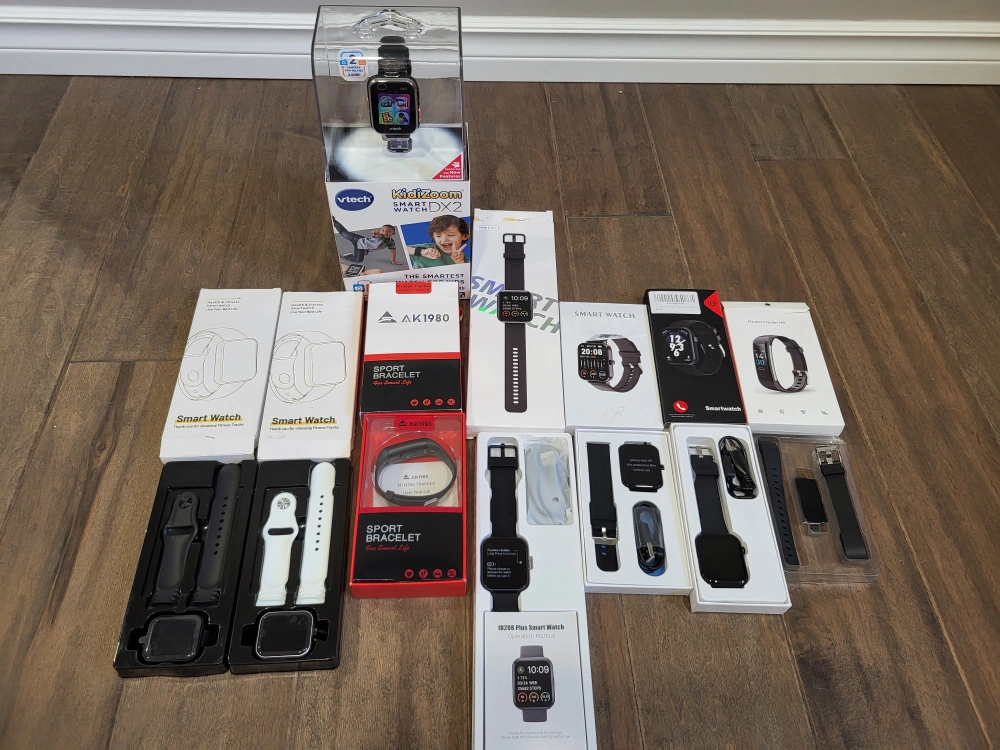 Large collection of new smartwatches and fitness trackers. Various colours and styles available. Includes kids' smartwatches. Step counter, heart rate, app, smartphone, health tracker, fitness, running, timer, pink black and blue colors. $30 firm each or 2 for $50
