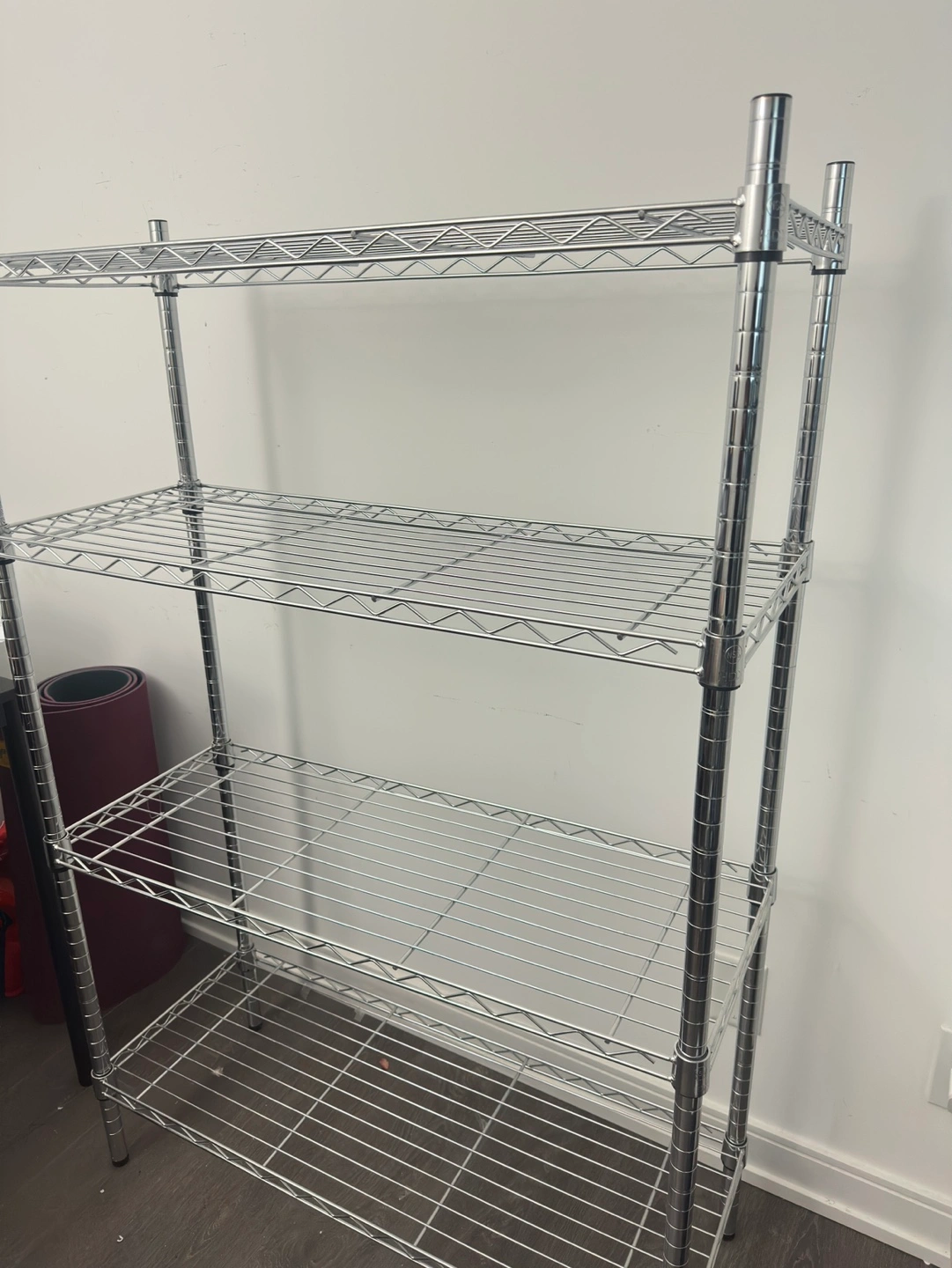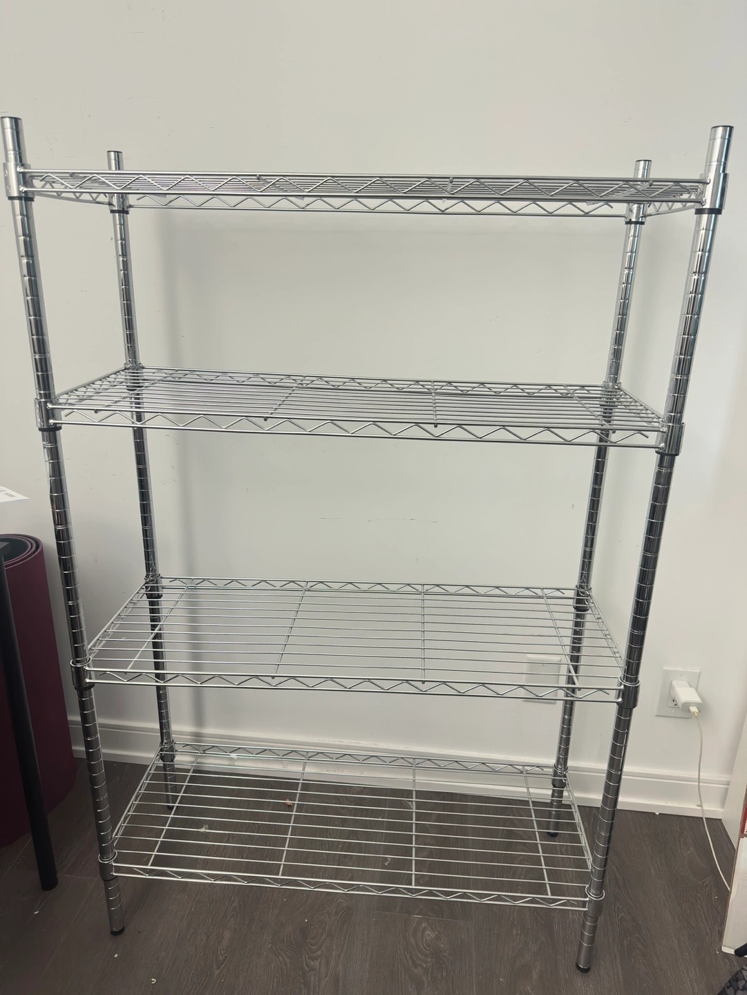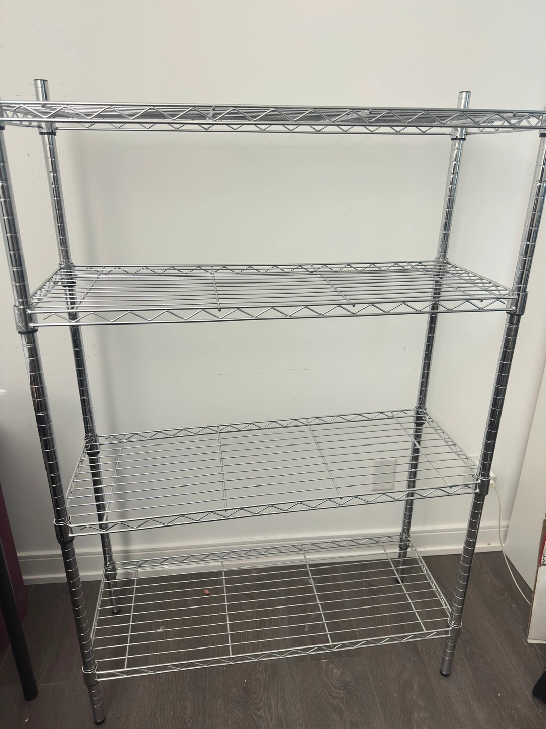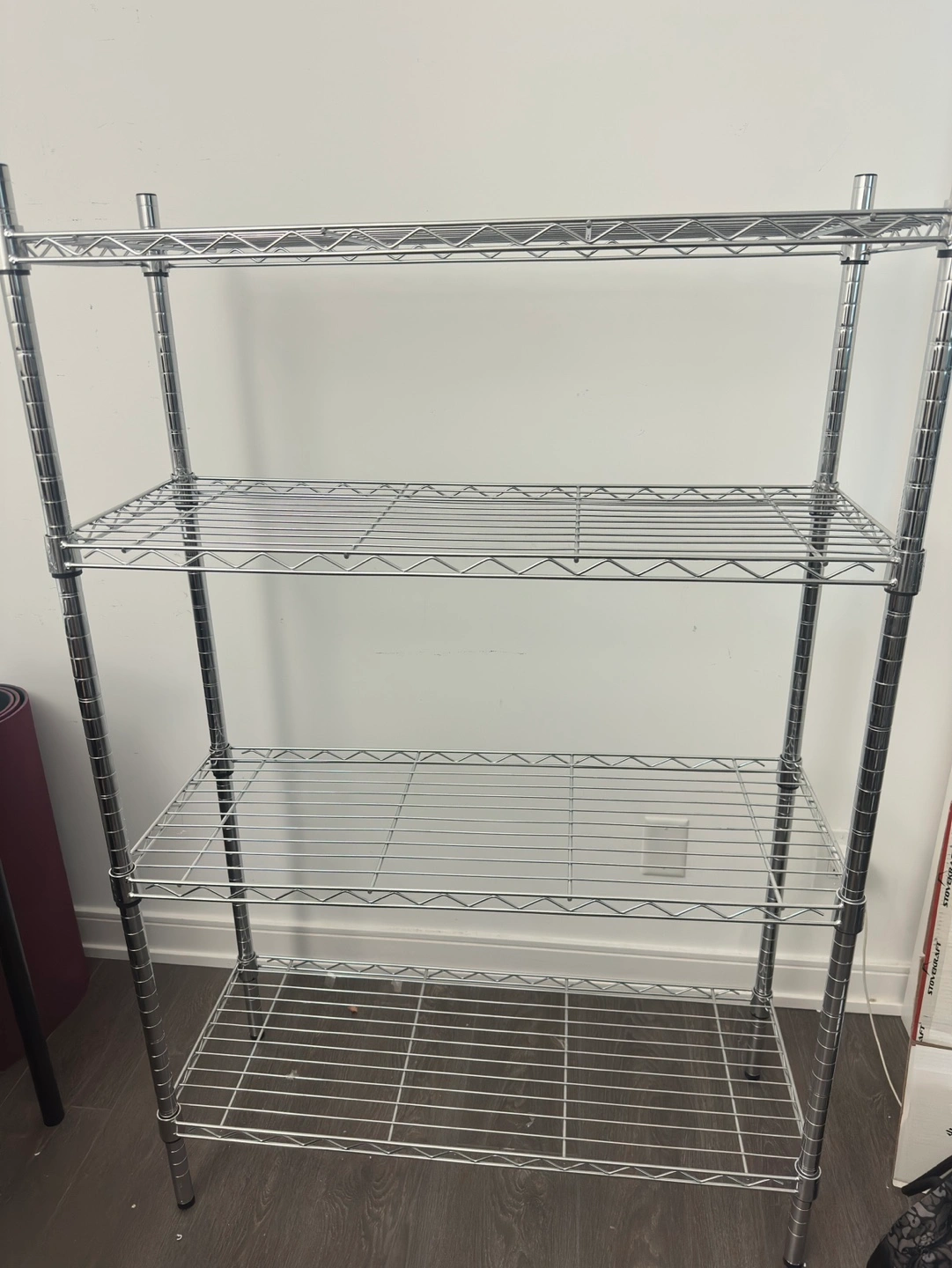Four-tier shelving unit.Metal wire construction. Good for storage. Assembled. 36-inch W x 54-inch H x 14-inch D Adjustable racks Can hold upto 1400 lb, very sturdy and strong Pickup near Kipling station