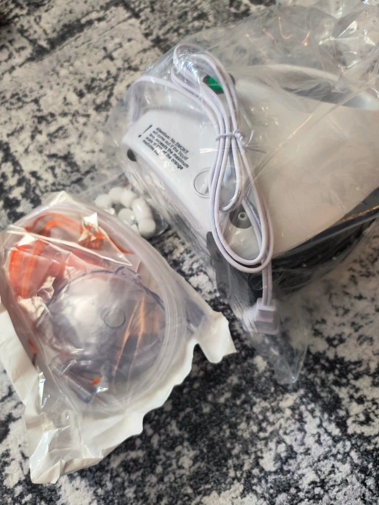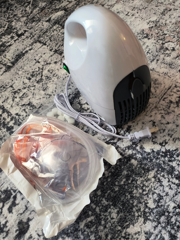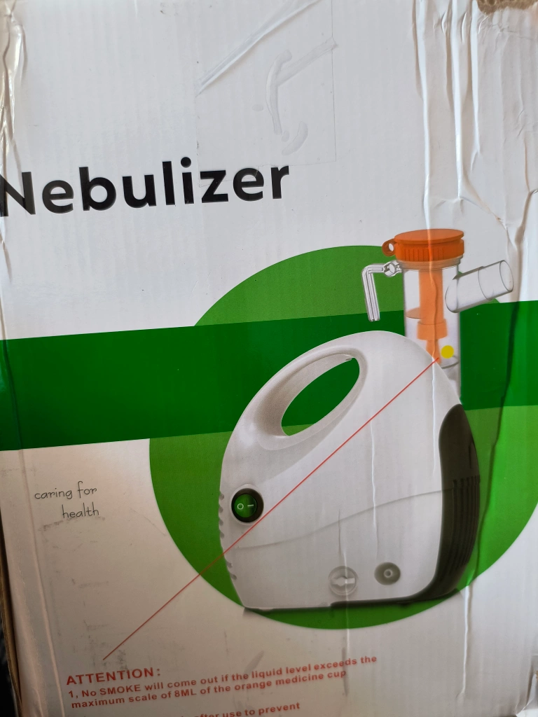 New, compact nebulizer. Includes mask and tubing. Great for travel or home use. Lightweight and easy to operate. Has a crack on the plastic air vent as shown in the picture