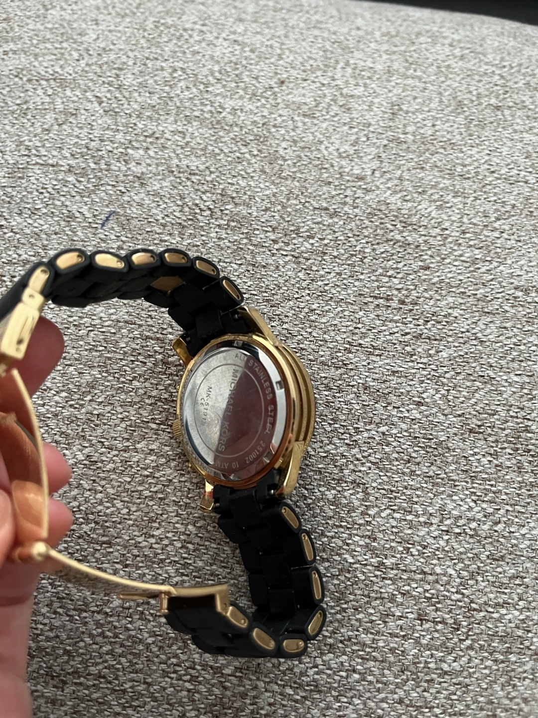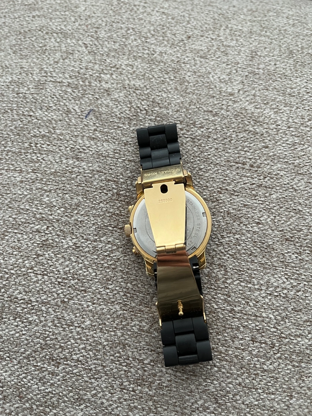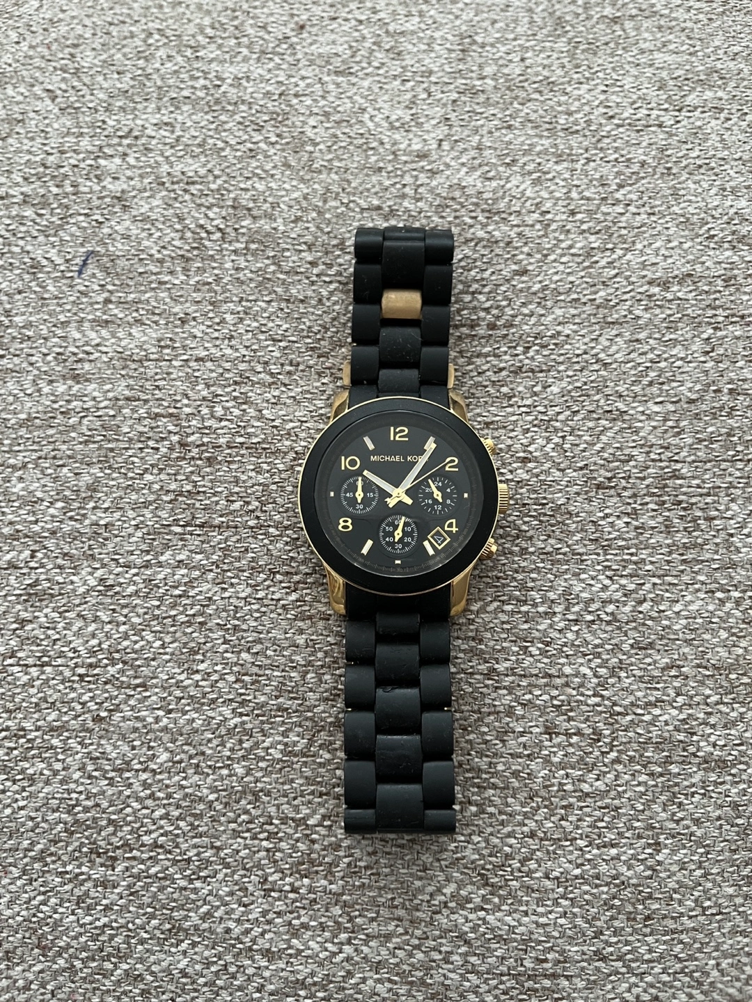 Stylish Michael Kors watch. Black silicone band, gold accents. Chronograph functionality. Pre-owned.