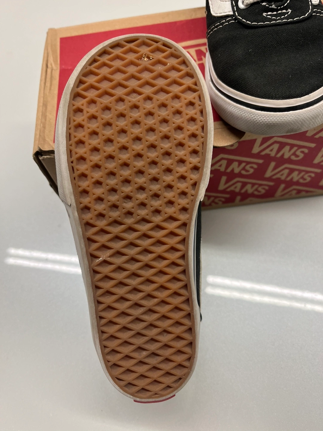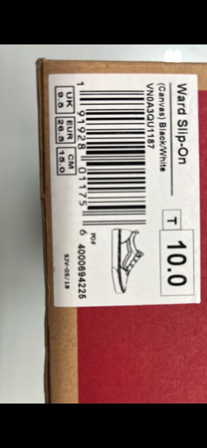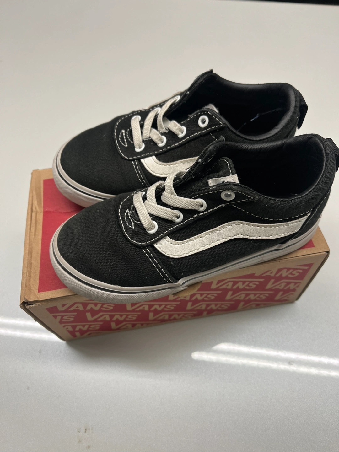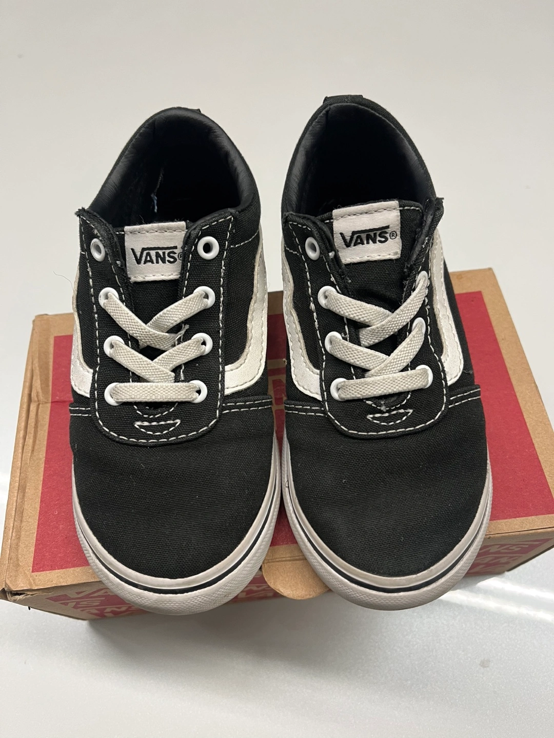 Vans kids slip-on shoes. Black canvas with white side stripe. Size 10.0. In good condition. Sold with original box.