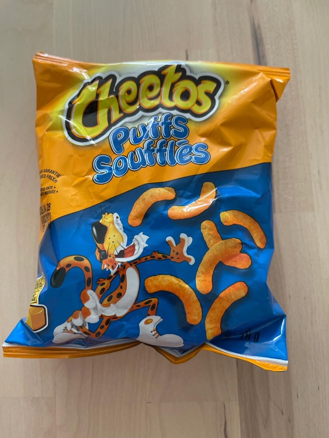 Bag of Cheetos Puffs Soufflés. Cheetah mascot on package. Appears unopened.