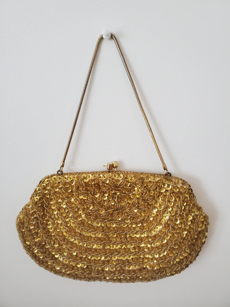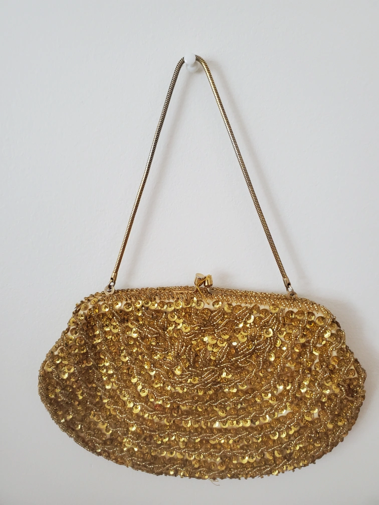 Gorgeous vintage evening bag. Gold sequins and beads. Metal clasp and chain strap. Fully lined interior. Perfect for a special occasion.