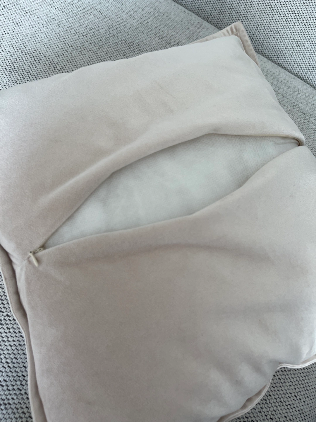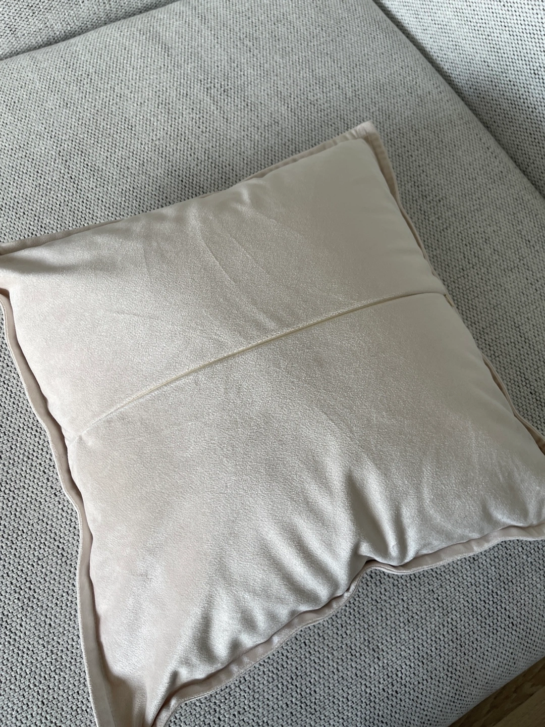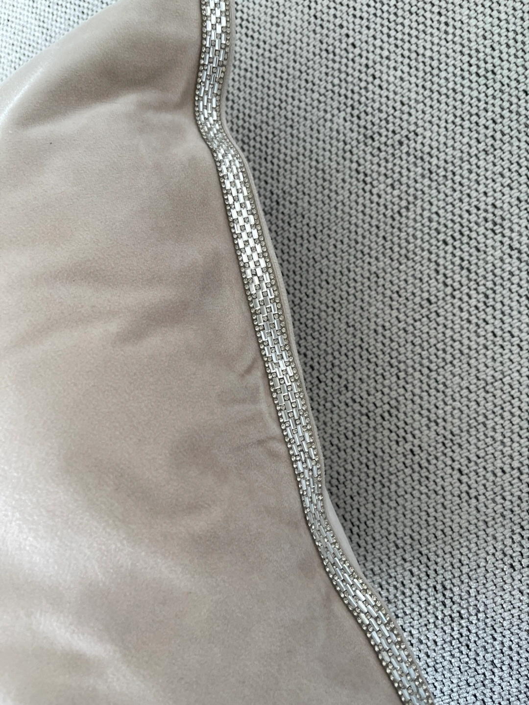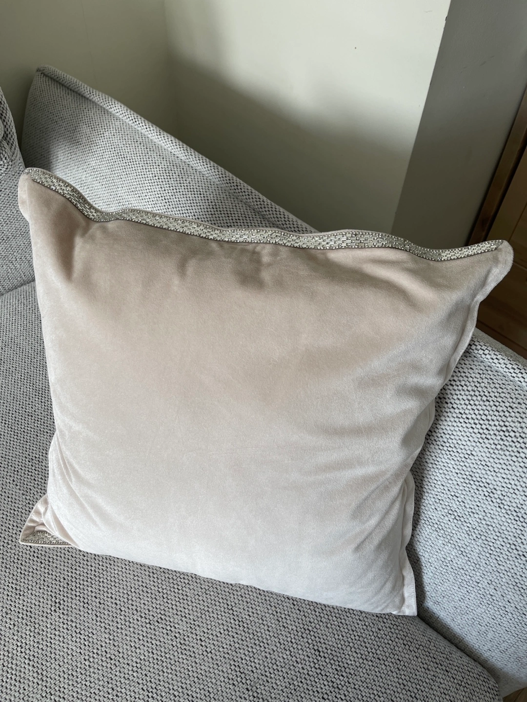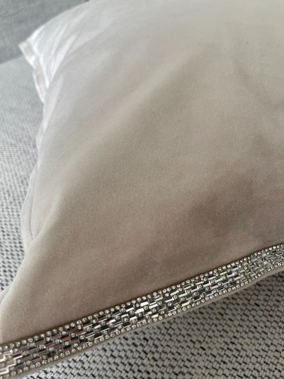 Soft beige velvet cushion. Features a decorative crystal trim. Zipper closure. Great for adding a touch of elegance to your living space.