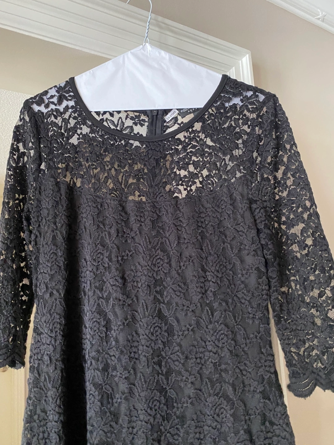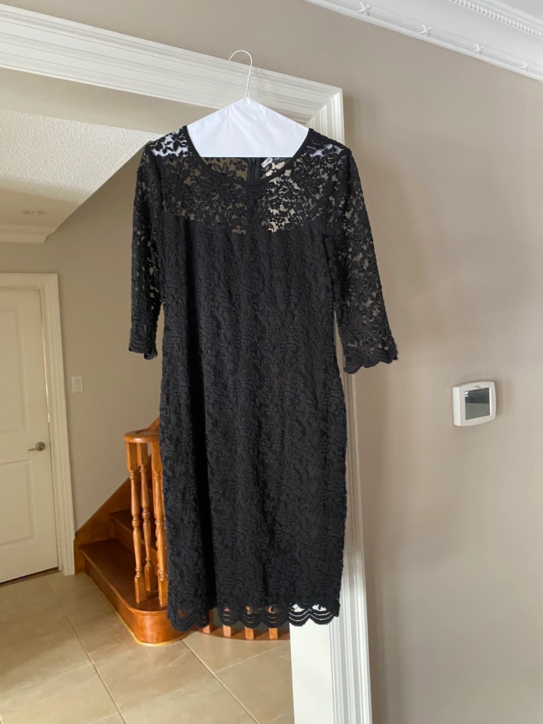 Beautiful black lace dress. Three-quarter sleeves. Back zipper. Scalloped hem.
