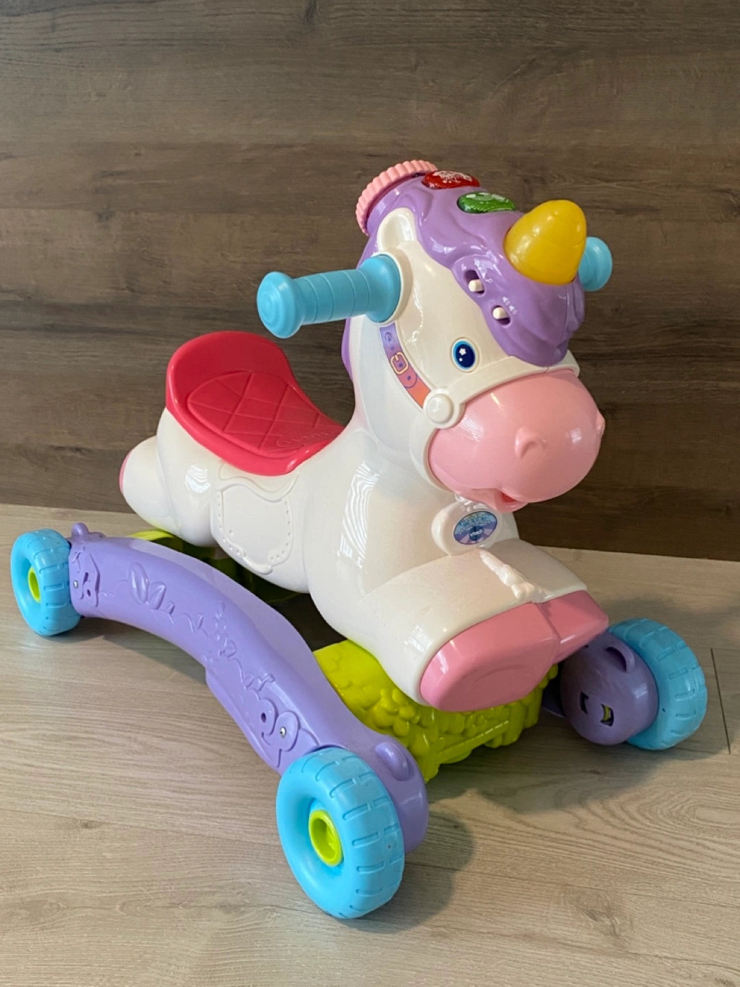 Go on a magical ride with the Prance & Rock Learning Unicorn™! This grow-with-me unicorn transforms from a rocker to a ride-on in seconds. As toddlers rock and ride, the built-in motion sensors respond with playful music and magical unicorn sounds to encourage gross-motor development and imagination. Pretend to visit castles and fly over rainbows with your new unicorn friend! Encourage fantasy play in Adventure mode with playful phrases and imaginative songs, then switch to Learning mode to introduce colors. Spin the bead wheel to hear fun sounds and short tunes and watch the unicorn’s horn twinkle in response. Requires 2 AAA batteries. Batteries included for demo purposes only. This unicorn has a transformable base to change it from a rocker to a ride-on toy as your child grows Learn about colors and encourage imaginative play with songs, melodies and playful phrases As your toddler rocks and rides, the motion sensor responds with magical sounds and music to encourage movement Switch between Learning and Adventure modes to double the fun.
