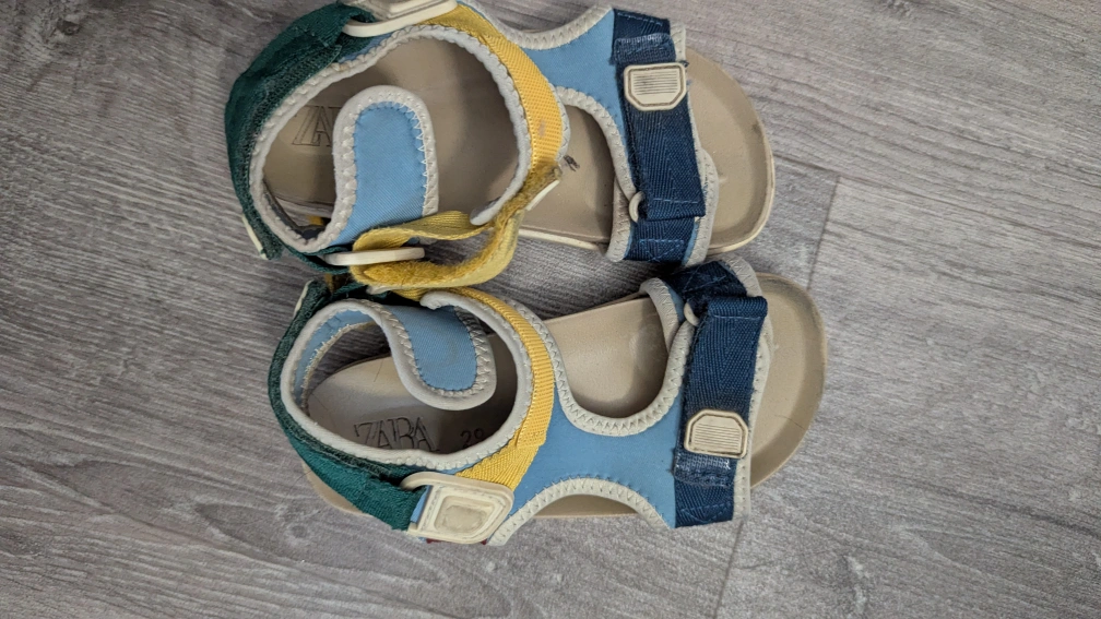 Pair of used Zara kids' sandals. Size 28. Blue, green, and yellow. Good for summer.