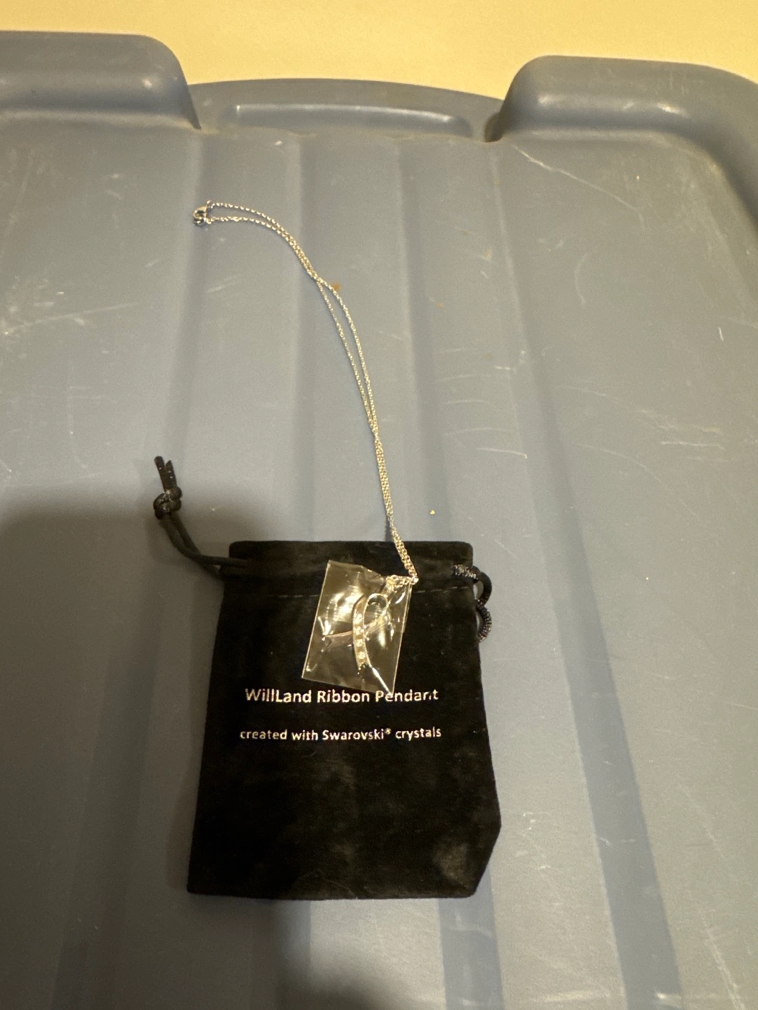 Silver-tone ribbon pendant necklace. Features clear crystals. Comes with a black velvet pouch. New, never worn.