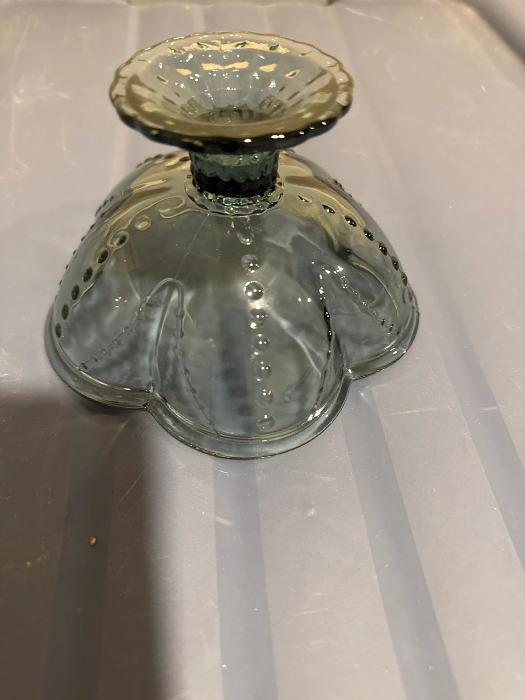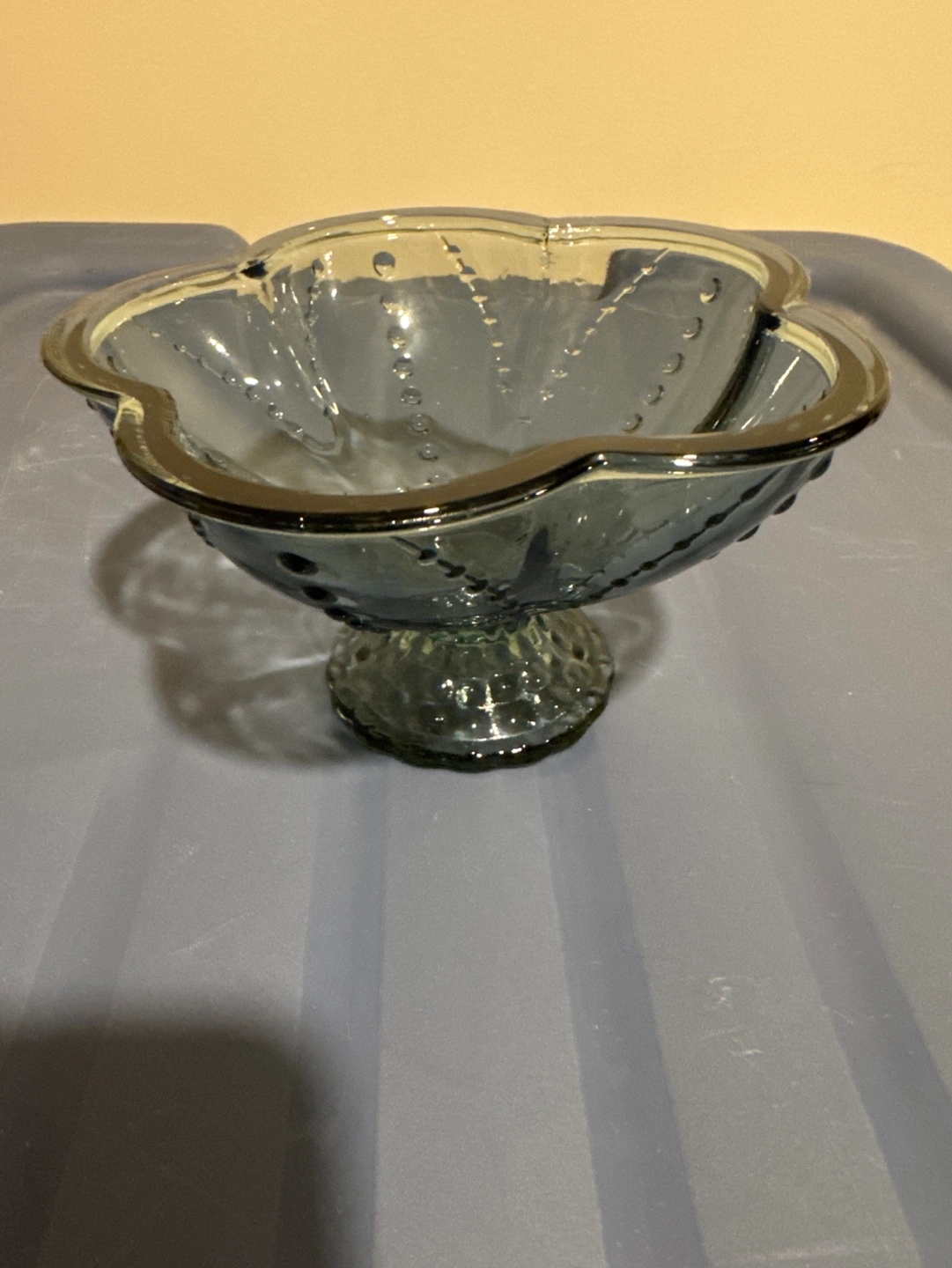 Unique floral shaped bowl. Features a pedestal base and textured detailing. Lovely green colour, perfect for relish or candy dish.