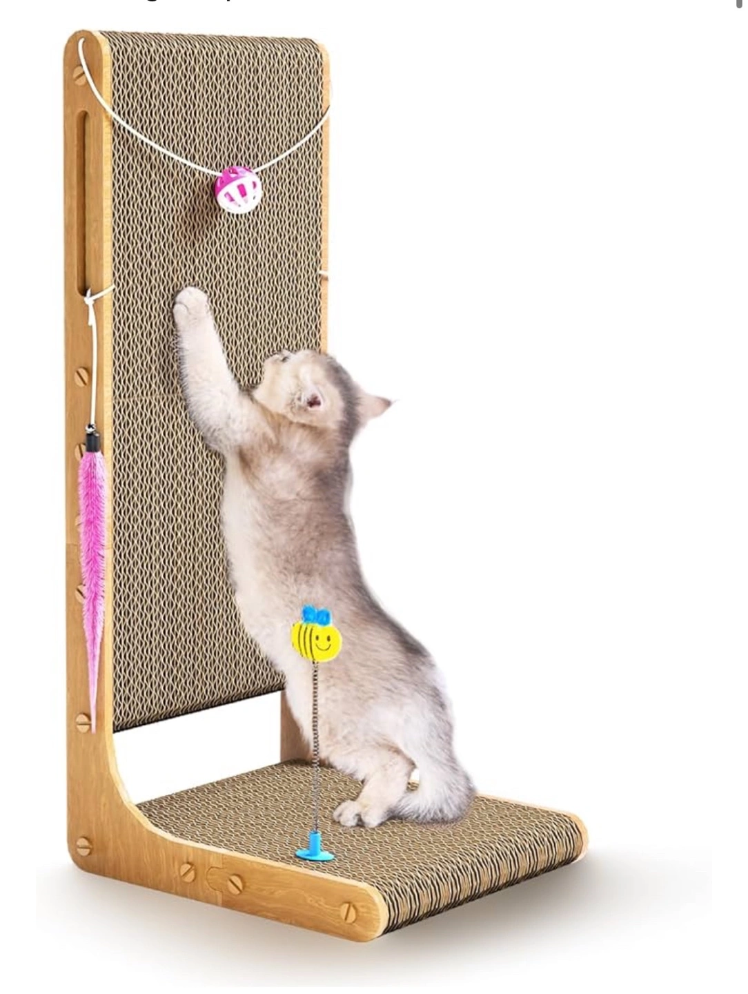 Wooden cat scratching post. Features cardboard scratching surface, dangling ball, and bee toy. Suitable for kittens and cats. This was a backup scratcher. My cat love these. Still in the box.