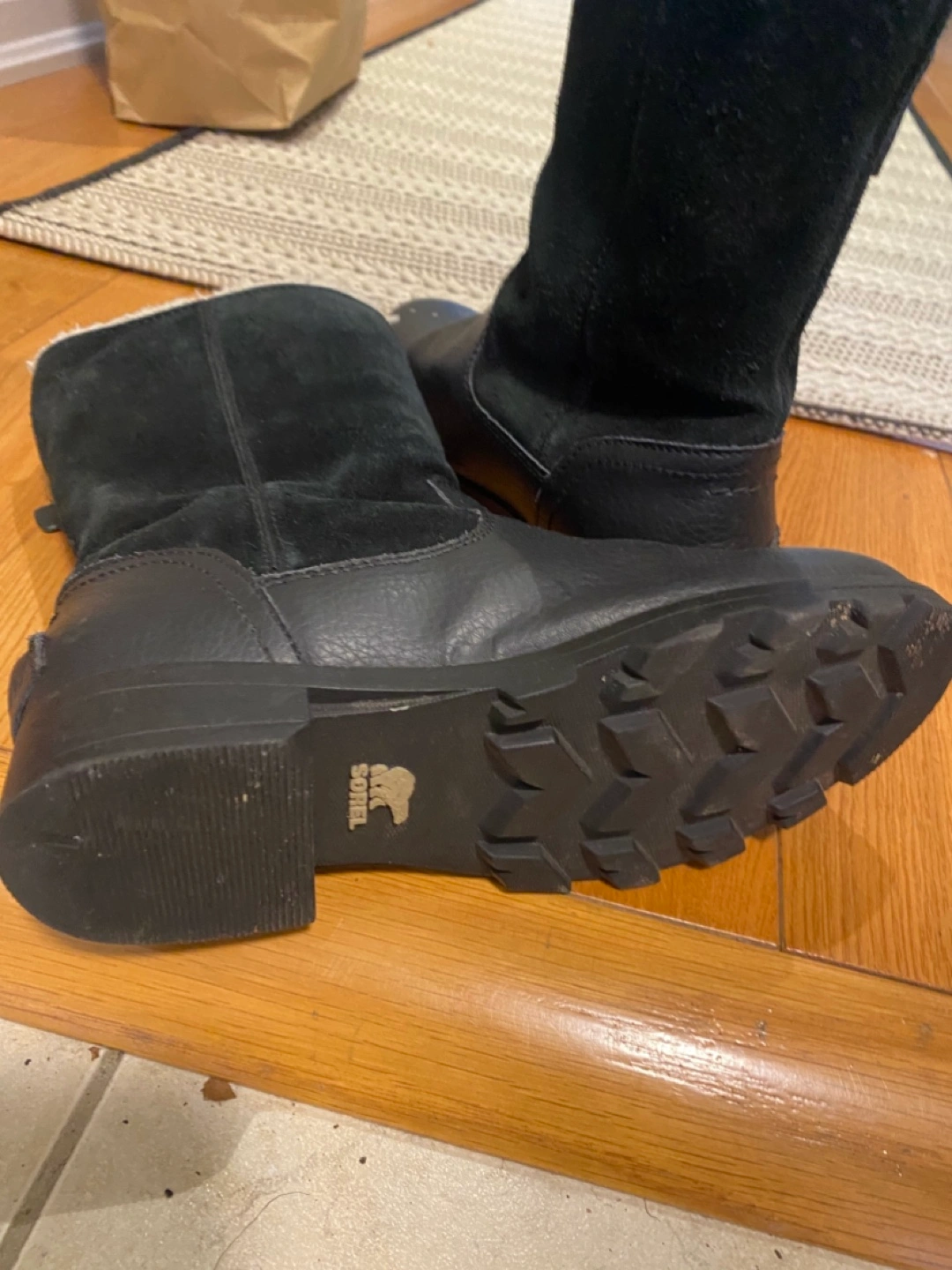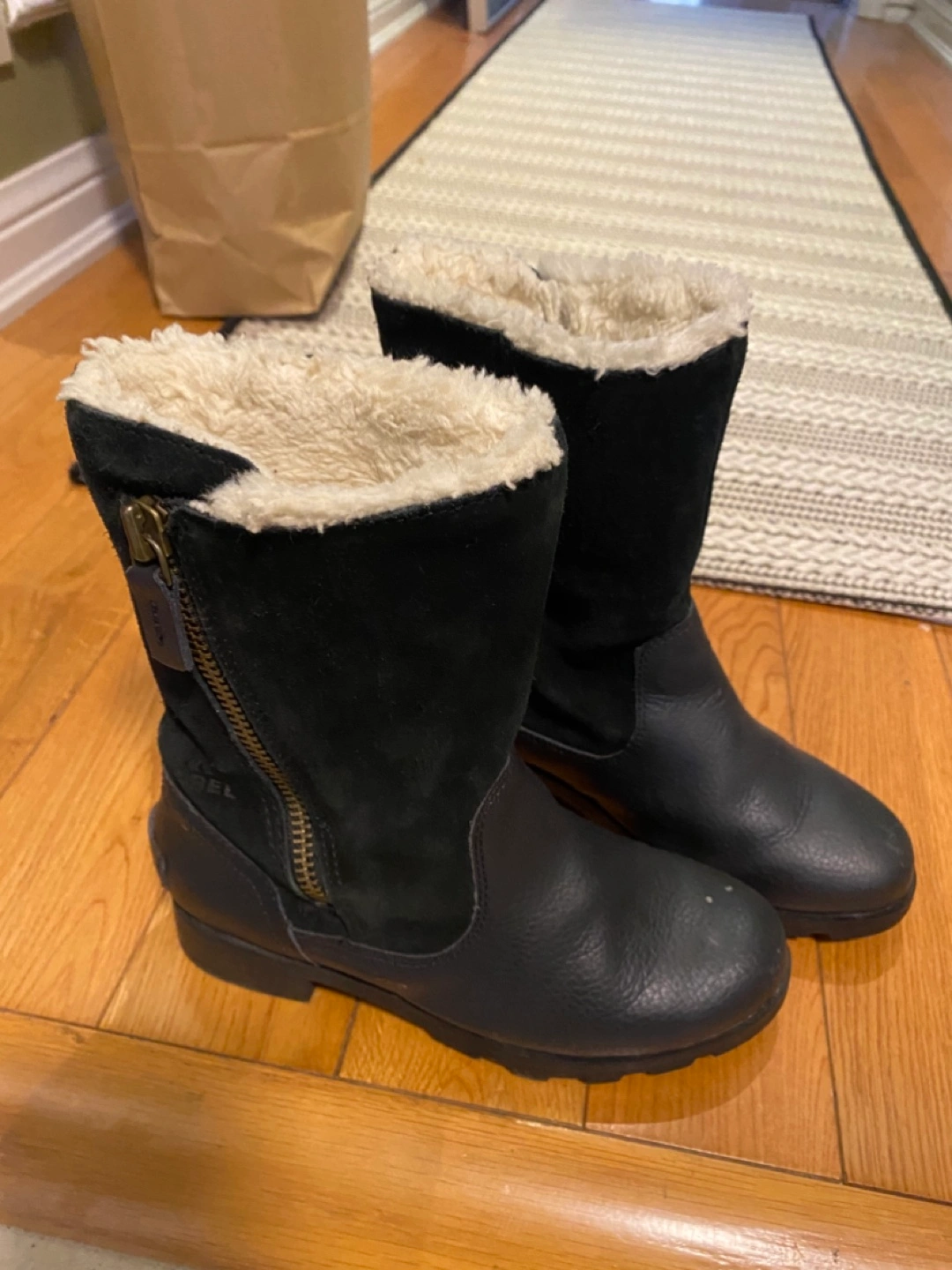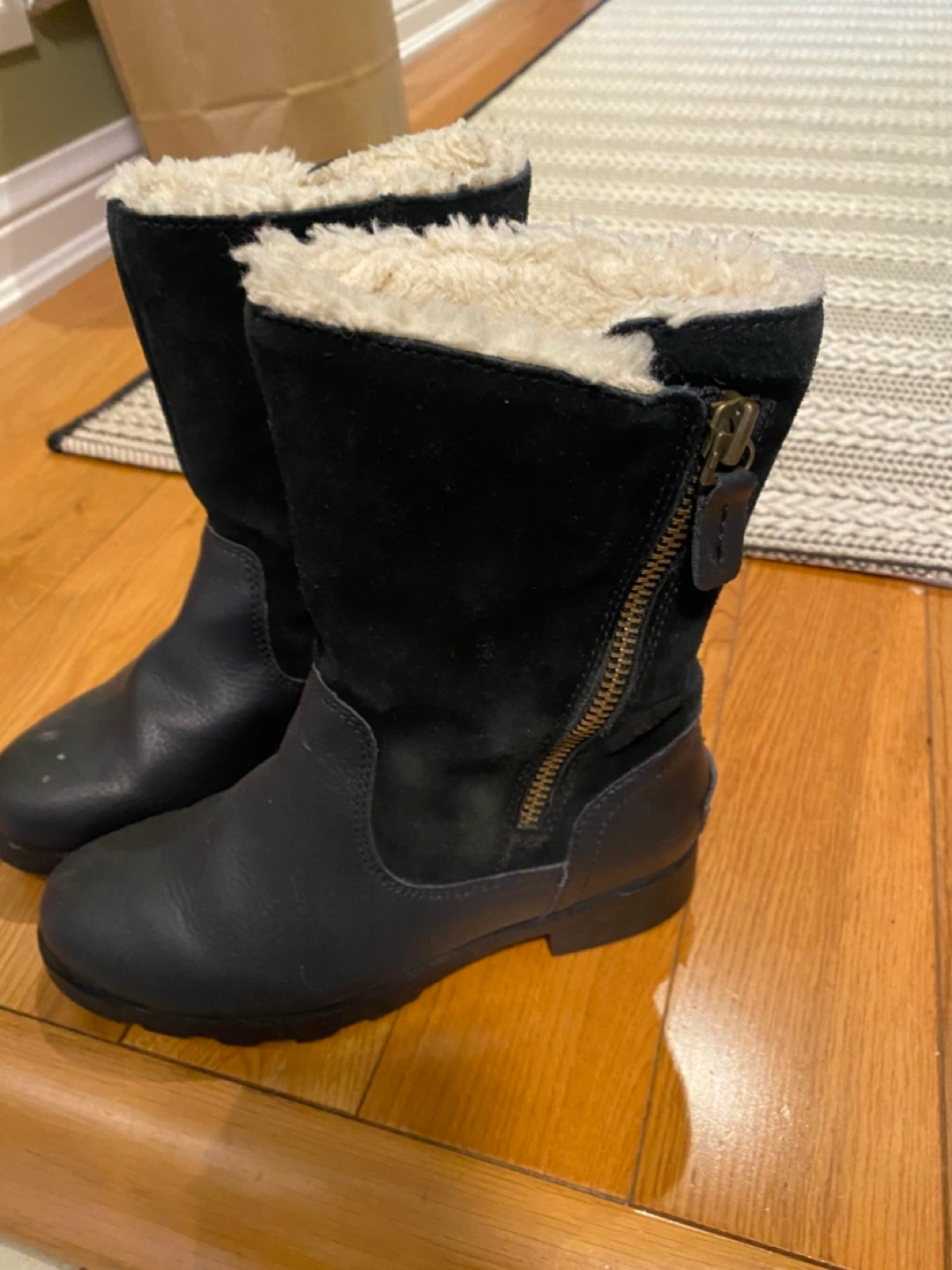 Black leather and suede Sorel boots. Side zipper. Warm shearling lining. Great for winter. Size 1