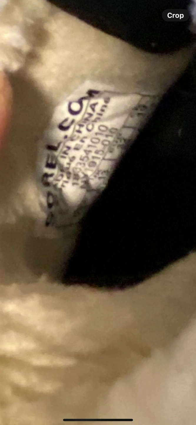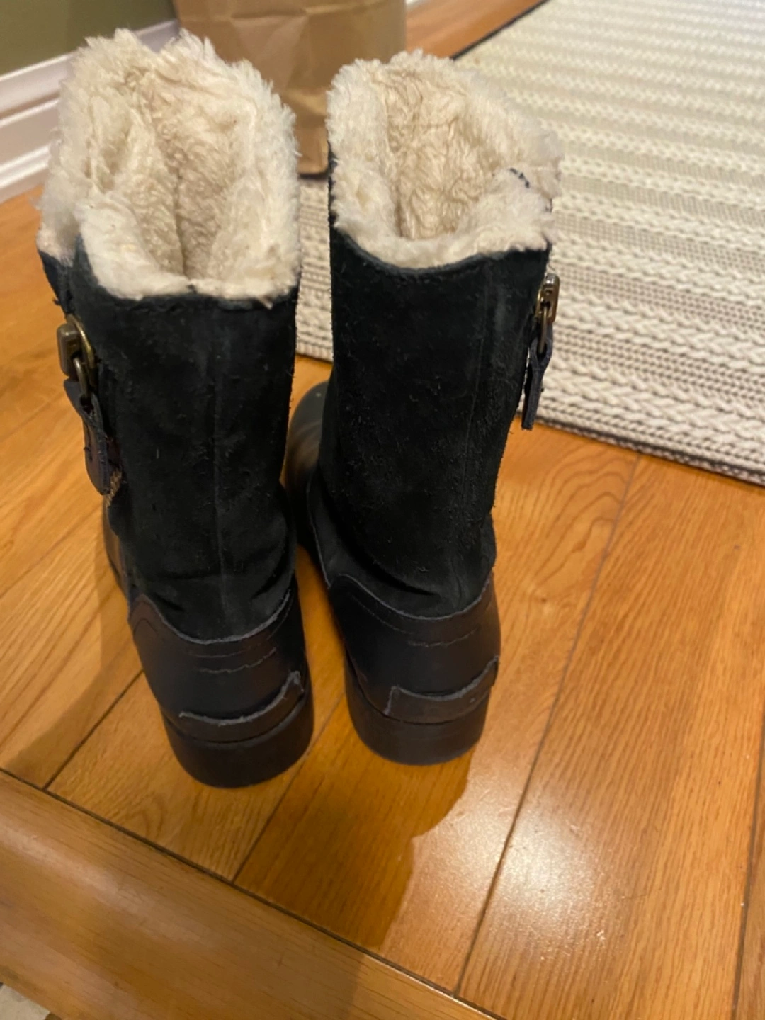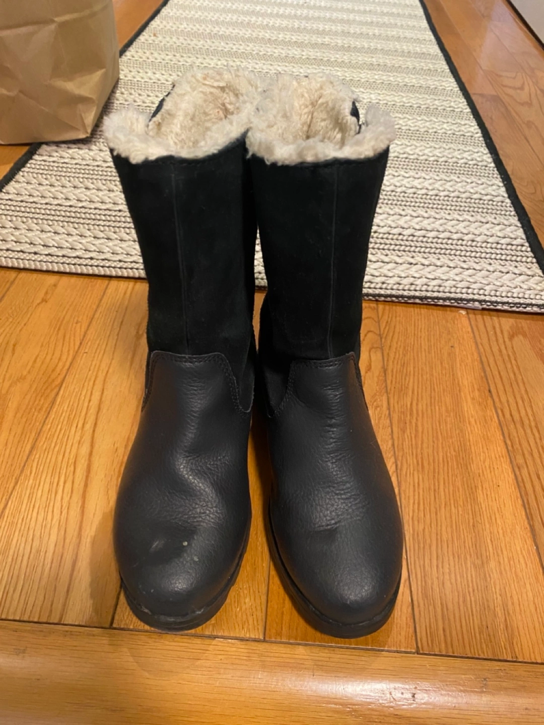 Black leather and suede Sorel boots. Side zipper. Warm shearling lining. Great for winter. Size 1