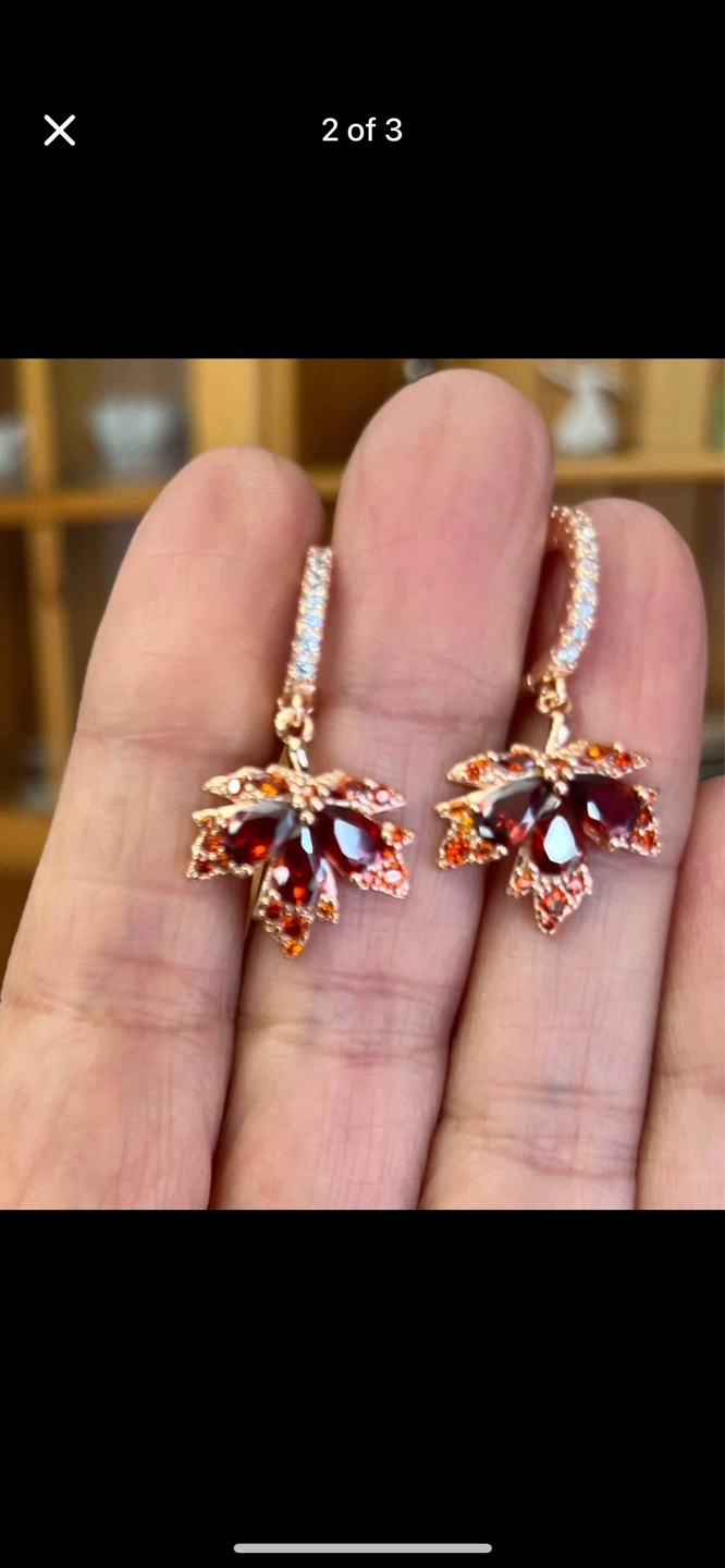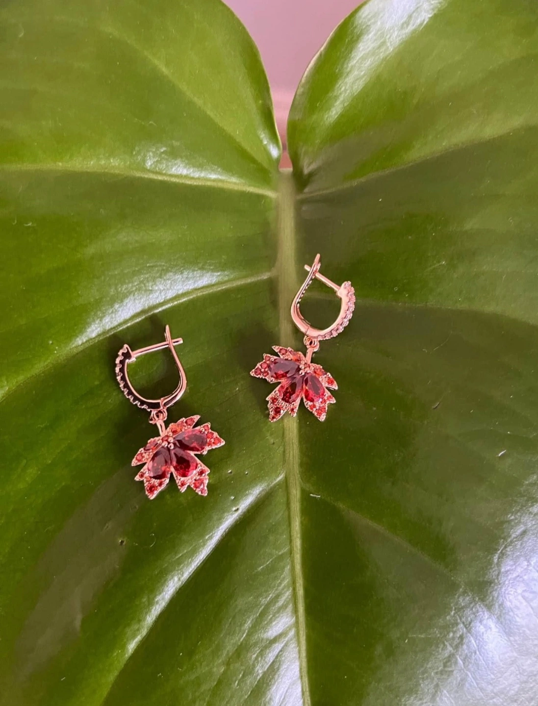 Beautiful pair of earrings. Rose gold color. The stones shaped like maple leaves. Elegant and eye-catching design. Love Canada ๐